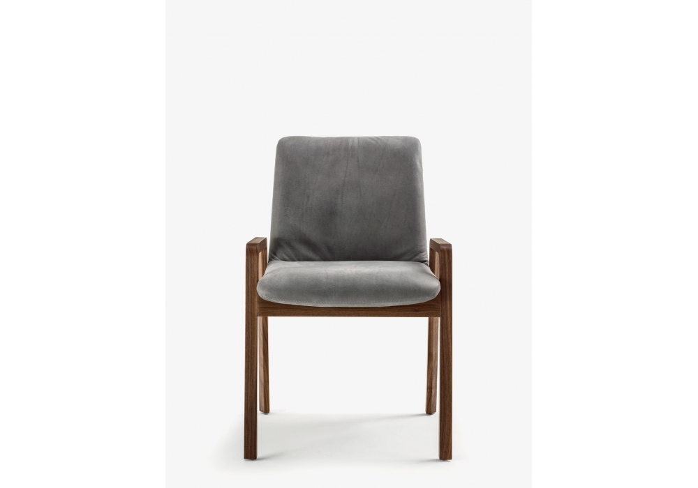 Noblé Chair von Gabriele & Giuliano Cappelletti für Riva 1920 entworfen, ist ein Stuhl, der sich durch eine Polyurethanschale auszeichnet, die mit einer Rückenlehne und einem bequemen Sitz aus Schaumstoff ausgestattet und mit Leder oder Stoff mit sichtbaren Nähten bezogen ist. Die Armlehnen aus Massivholz, erhältlich in zwei Versionen (H. 53 cm oder H. 64 cm), bilden eine durchgehende Linie mit den Beinen.