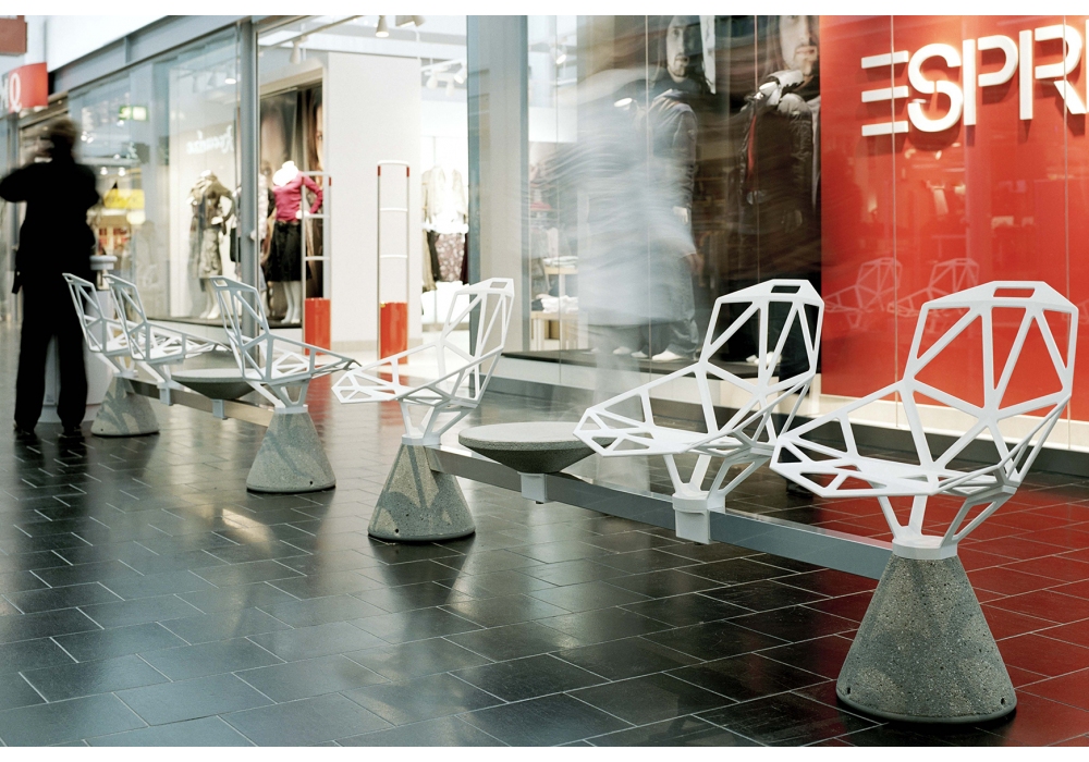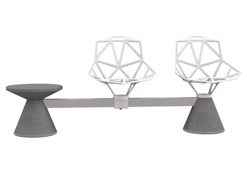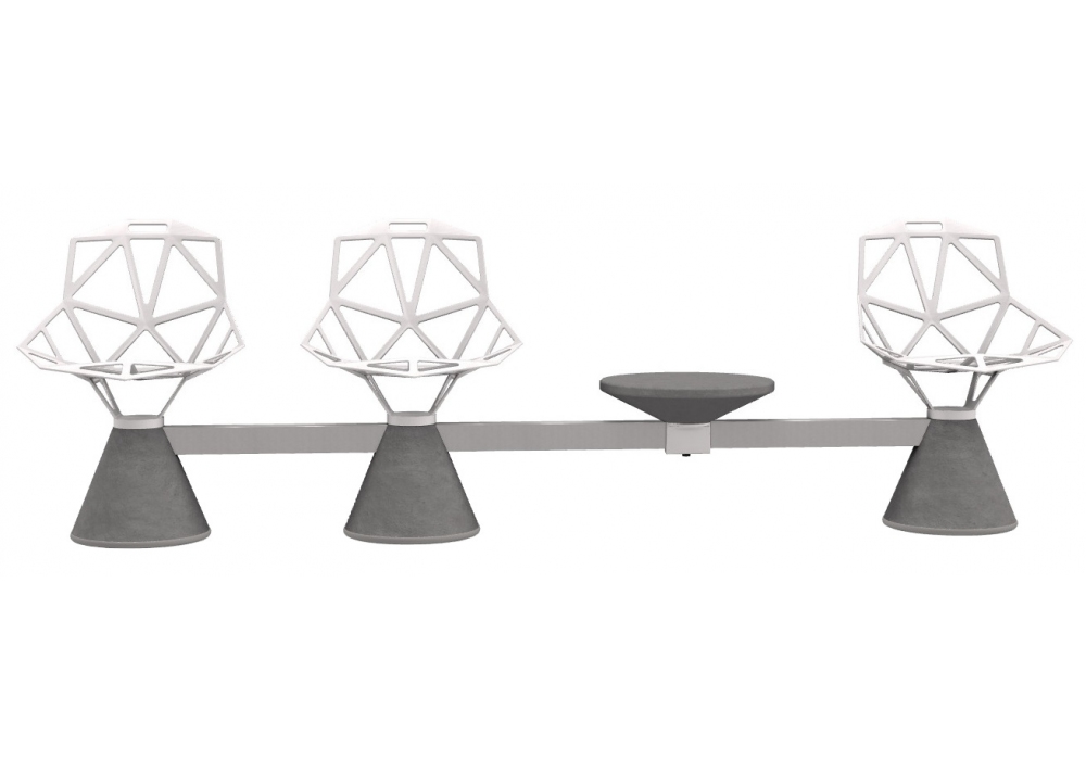 Chair_One System 1 von Konstantin Grcic für Magis entworfen, ist ein Sitzsystem auf einem Balken, das auch für den Außenbereich geeignet ist. Sitz aus Aluminiumdruckguss mit Fluorotitanisierungsbehandlung und Polyesterlackierung, Stange aus naturfarben eloxiertem Aluminium und Sockel aus naturfarben transparent lackiertem Beton. Erhältlich in verschiedenen Zusammensetzungen.