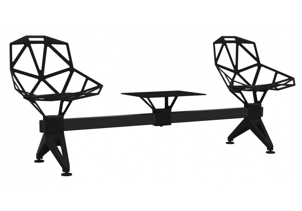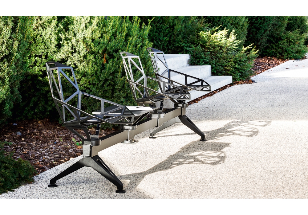Chair_One System 2 von Konstantin Grcic für Magis entworfen, ist ein Sitzsystem auf einem Balken, das auch für den Außenbereich geeignet ist. Sitz aus Aluminiumdruckguss mit Fluorotitanisierung und Polyesterlackierung, Stange aus eloxiertem Aluminium und Fuß aus weiß oder schwarz lackiertem Aluminium. Erhältlich in verschiedenen Ausführungen und Zusammensetzungen.