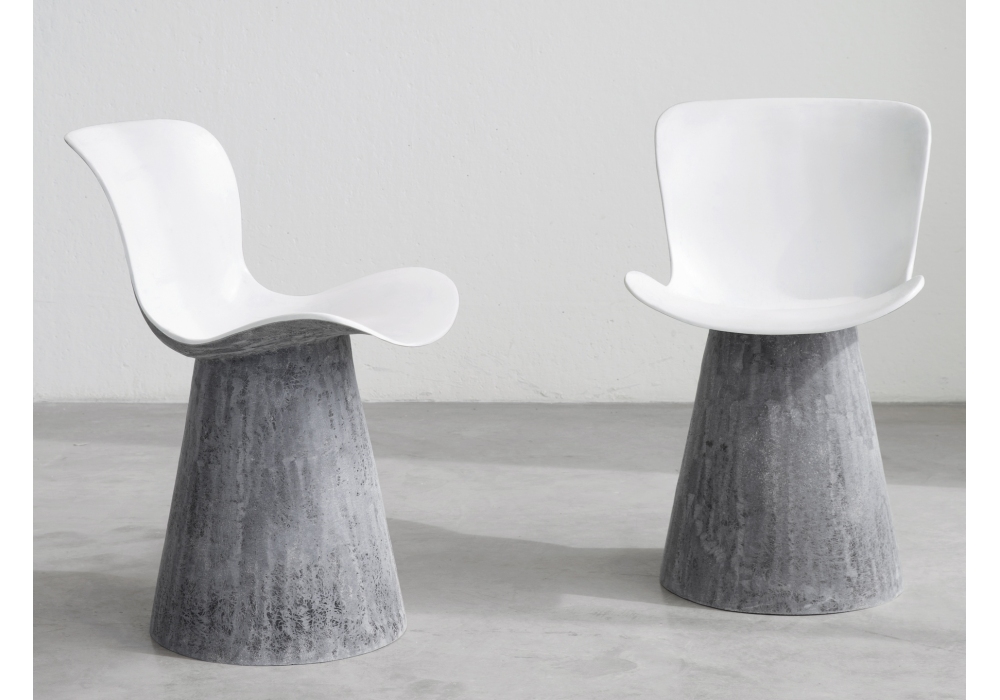 Equilibria von Verter Turroni für ImperfettoLab entworfen, ist ein Stuhl, der aus einer Basis aus rohem Fiberglas besteht, die einen Sitz mit weichen und einhüllenden Linien anhebt und stützt.