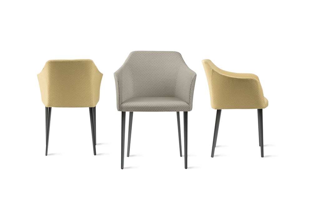 Carmen von Stefano Sandonà und Sabrina Bettini für Riflessi entworfen, ist ein Stuhl mit Armlehnen mit Polsterung aus flexiblem kaltgeformtem Polyurethan und Stahlrahmen. Die Rahmenstruktur ist in die Karosserie integriert. Beine aus lackiertem Aluminium und Polsterung aus Stoff oder Leder. Verfügbar in mehreren Ausführungen.