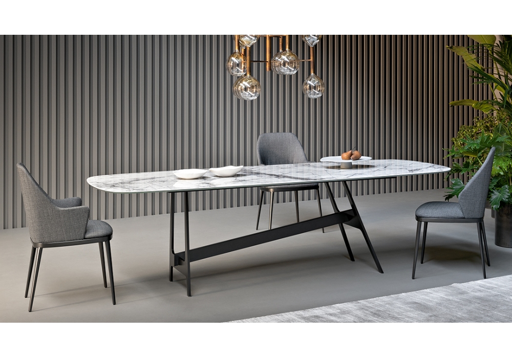 Miss Mida von Gino Carollo für Bonaldo entworfen, ist ein Stuhl mit Struktur aus Stahl und Sperrholz, Polsterung aus nicht verformbarem hochdichtem Gummi und nicht abnehmbarem Bezug, verfügbar in verschiedenen Materialien und Ausführungen. Die Beine sind aus Metall, in verschiedenen Kategorien und Farben.