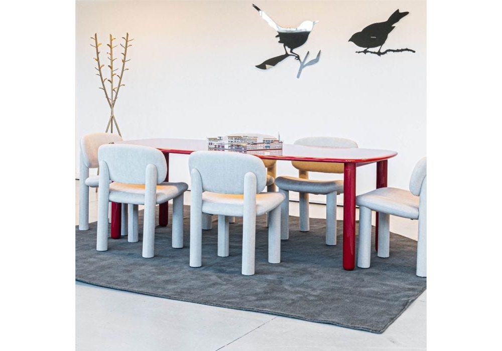 Tottori von Kateryna Sokolova für Driade entworfen, ist ein Stuhl mit Struktur aus flexiblem Polyurethan mittlerer Dichte, Füße aus PE zum Ausruhen auf dem Boden. Die Polsterung ist mit der Möglichkeit unterschiedlicher Materialien für die Beine im Vergleich zu denen des Sitzes und der Rückenlehne fixiert. Nur für den internen Gebrauch.