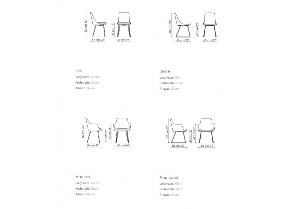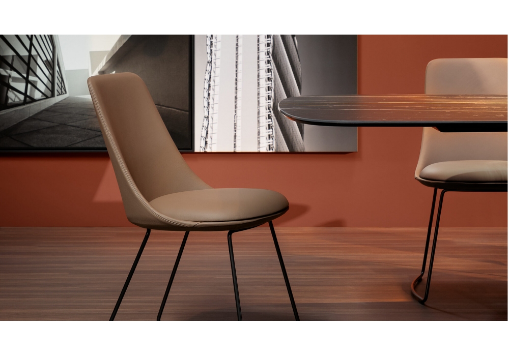 Itala, von Gino Carollo für Bonaldo entworfen, ist ein Stuhl, der in verschiedenen Modellen erhältlich ist, mit Kufengestell oder mit 4 Beinen aus lackiertem Metall in verschiedenen Ausführungen. Der nicht abnehmbare Bezug ist aus Stoff oder Leder in verschiedenen Farben.