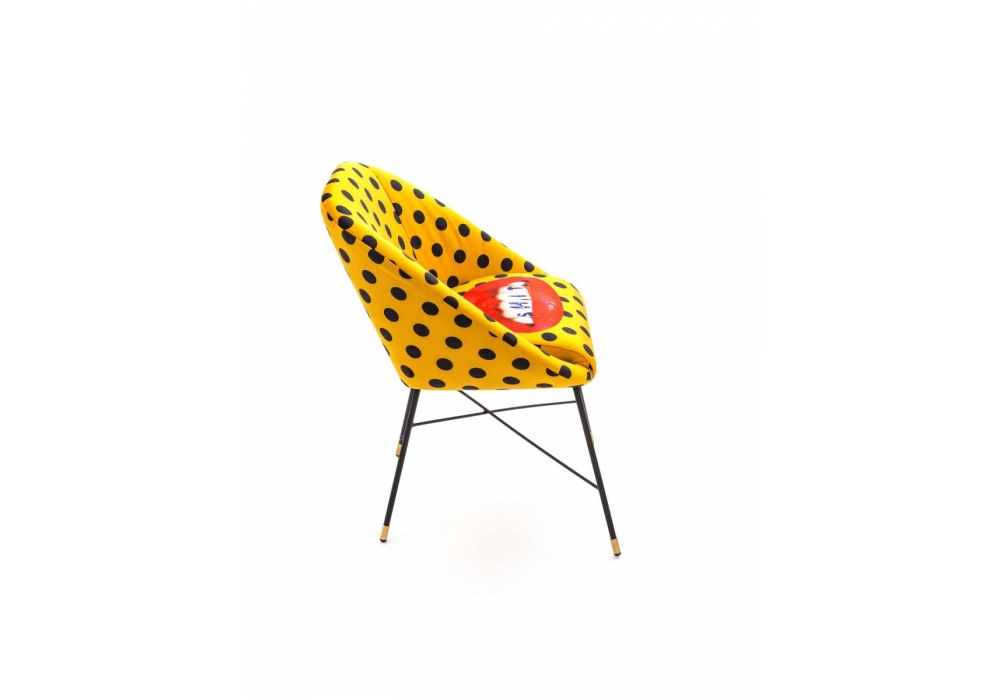 Shit, von Toiletpaper für Seletti entworfen, ist ein Stuhl mit Vierfußgestell aus schwarz lackiertem Metallrohr und Messingdetails. Der Korpus ist mit Polyurethan gepolstert und mit Polyester überzogen.
