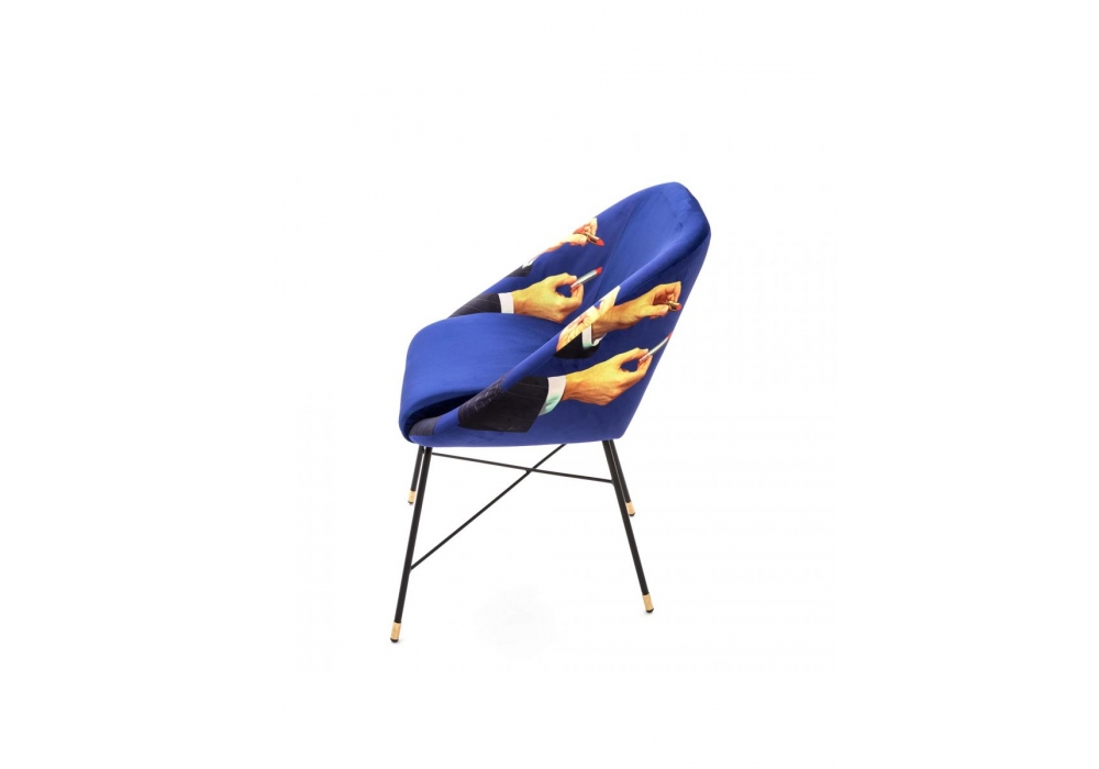 Lipsticks von Toiletpaper für Seletti entworfen ist ein Stuhl mit schwarzen Metallrohrfüßen mit Messingdetails. Der Korpus besteht aus Sperrholz mit Polyurethan-Polsterung und Polyesterbezug