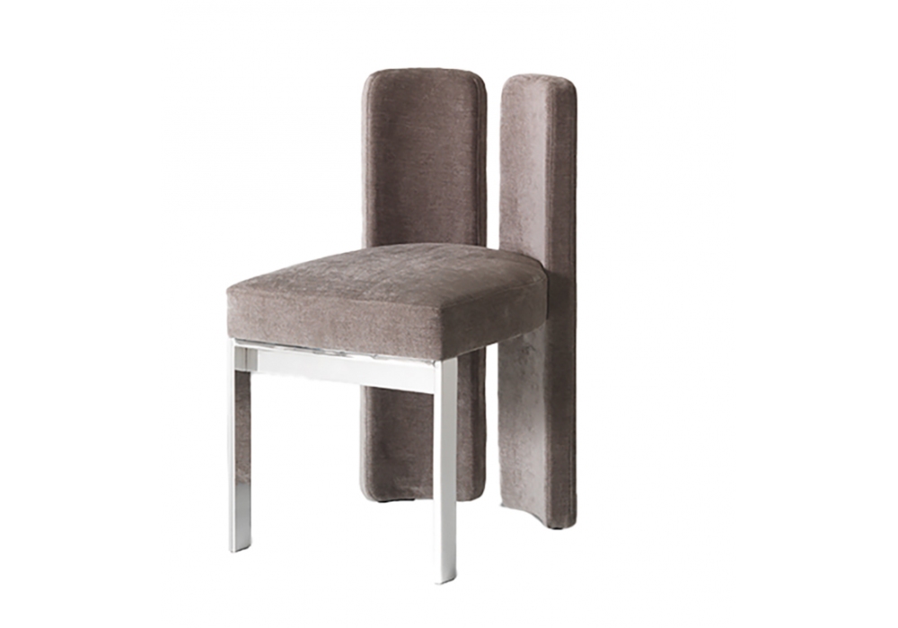 Nina von Elena Pancaldi für Emmemobili entworfen, ist ein Stuhl mit Struktur aus gebogenem Sperrholz mit Schaumstoffpolsterung, bezogen mit Stoff, Samt oder Leder in verschiedenen Ausführungen. Die Basis ist aus Messing. Erhältlich mit Rückenlehne in zwei verschiedenen Höhen.