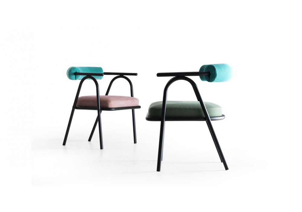 Baba von Serena Confalonieri für My Home Collection entworfen, ist ein Stuhl mit einer Struktur aus lackiertem Stahlrohr. Der Rücken und die Rückenkissen sind aus Polyurethankautschuk und Polyesterfaser. Die Stoffpolsterung kann einfarbig oder mehrfarbig sein. Baba ist in verschiedenen Verkleidungs- oder Strukturausführungen erhältlich.