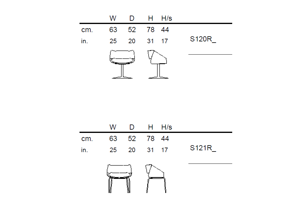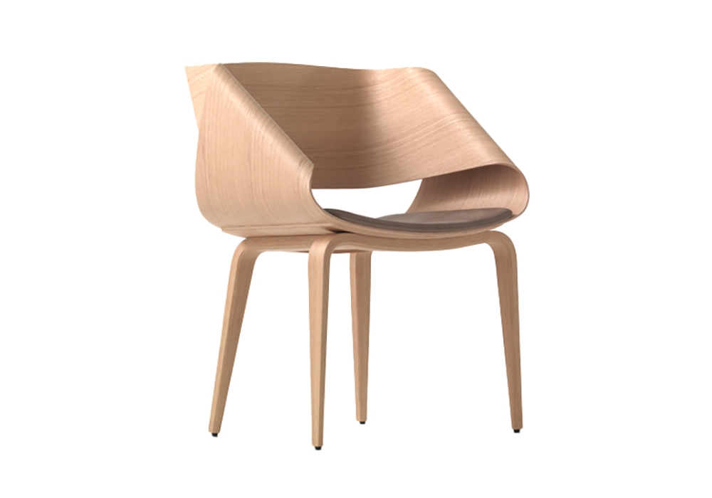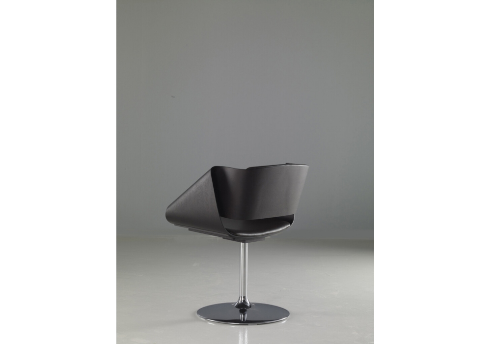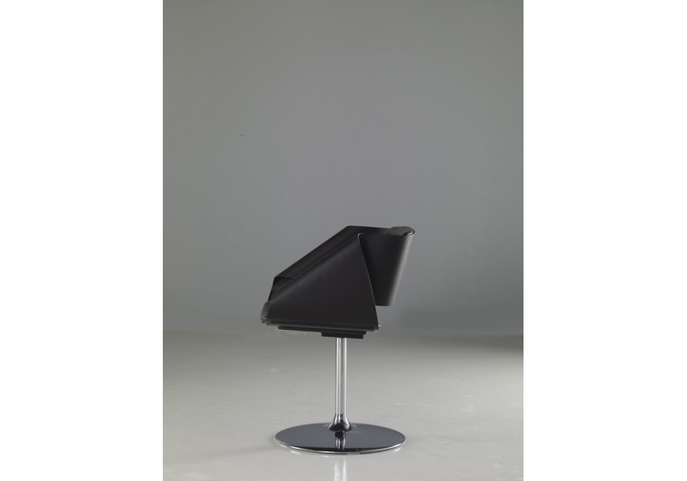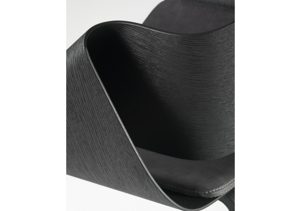 Nastro, von G. D. Harcourt für Emmemobili entworfen, ist ein Stuhl, der aus einer einzigen Platte aus furniertem, gebogenem Sperrholz besteht. Vorschlag mit drehbarer Basis oder feststehend mit vier Metallbeinen. Festes Kissen mit Holzauflage, mit Schaumstoff gepolstert und mit Leder überzogen.
