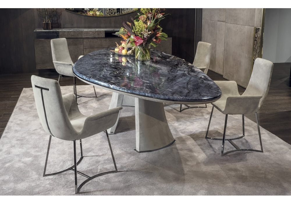 Coral von Giuseppe Viganò für Longhi entworfen, ist ein Stuhl mit interner Struktur aus kaltgeformtem geschäumtem Eisen. Außenstruktur aus galvanisiertem Metall mit nicht abnehmbarem Lederbezug.