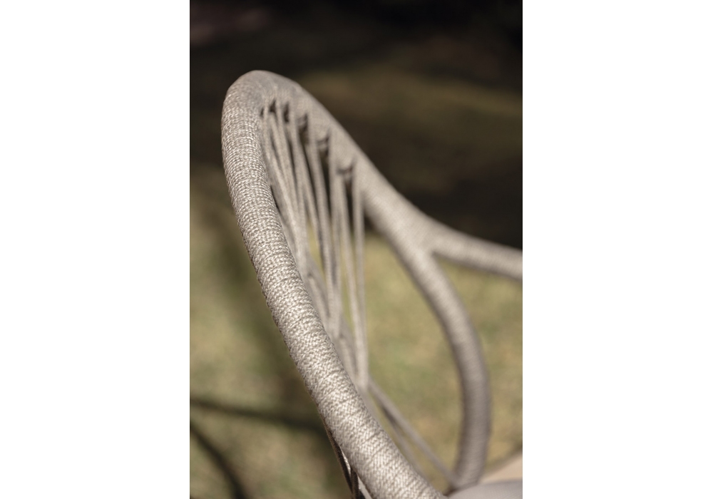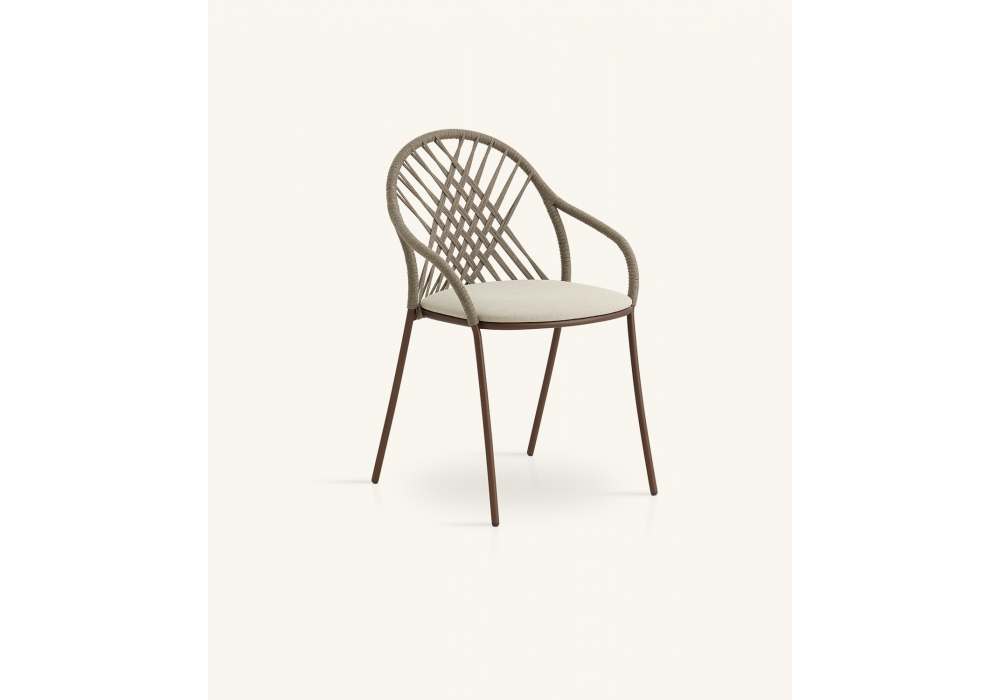 Petale von MUT Design für Expormim entworfen, ist ein Outdoor-Stuhl mit Struktur aus Edelstahlrohr und handgeflochtener Rückenlehne aus hochfestem Seil. Erhältlich in verschiedenen Ausführungen und in der Version mit oder ohne Armlehnen.