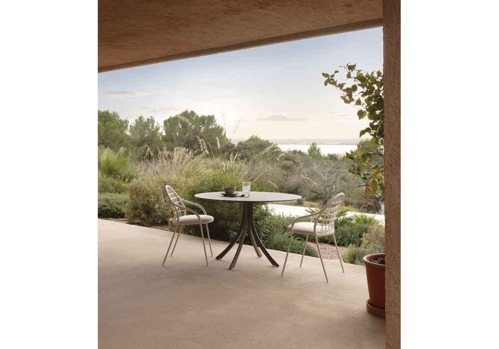 Petale von MUT Design für Expormim entworfen, ist ein Outdoor-Stuhl mit Struktur aus Edelstahlrohr und handgeflochtener Rückenlehne aus hochfestem Seil. Erhältlich in verschiedenen Ausführungen und in der Version mit oder ohne Armlehnen.