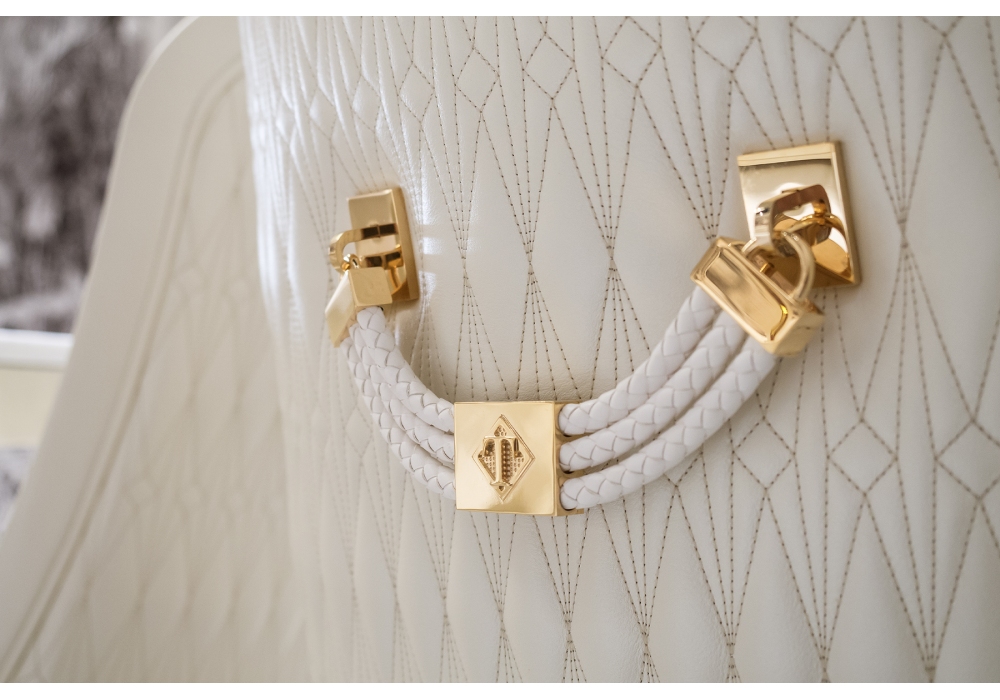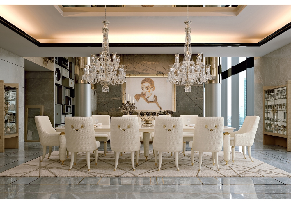 Numero Tre von Roberto Serio für Turri entworfen, ist ein Stuhl mit Struktur aus Sperrholz und Massivholz, gepolstert mit Polyurethanschaum mit mehreren Dichten. Polsterung in verschiedenen nicht abnehmbaren Stoffen oder Ledern. Die Beine sind aus Massivholz und passend zur Rückenlehne mit besticktem Leder bezogen. Auf der Rückseite befindet sich ein Griff aus geflochtenem Leder und goldenem Metall. Verfügbar in der Version mit oder ohne Armlehnen.