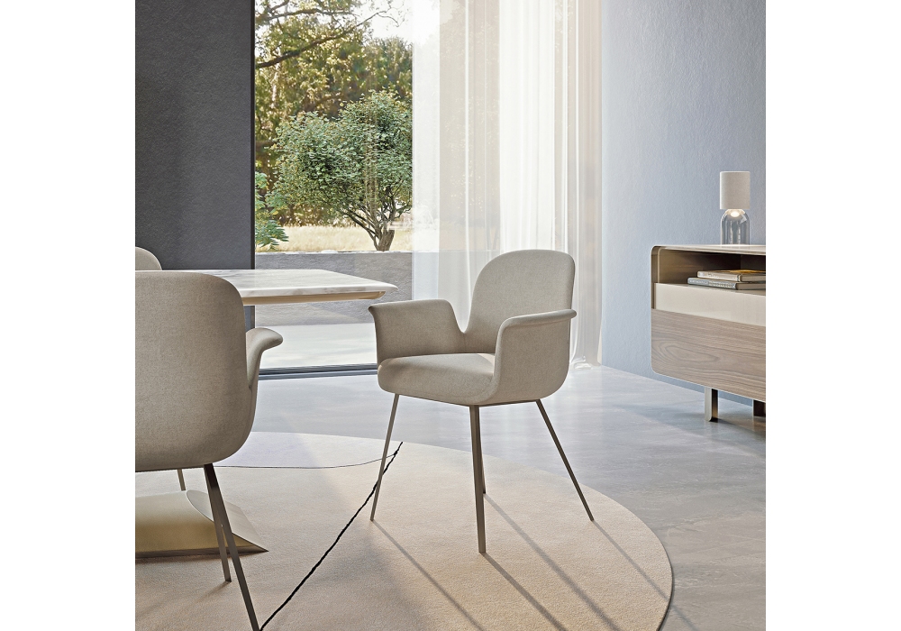 Soul von Giuseppe Viganò für Turri entworfen, ist ein Stuhl mit Sperrholzstruktur, Polsterung aus Polyurethanschaum mit mehreren Dichten und nicht abnehmbarem Bezug aus Stoff oder Leder. Metallbeine in verschiedenen matten Ausführungen.