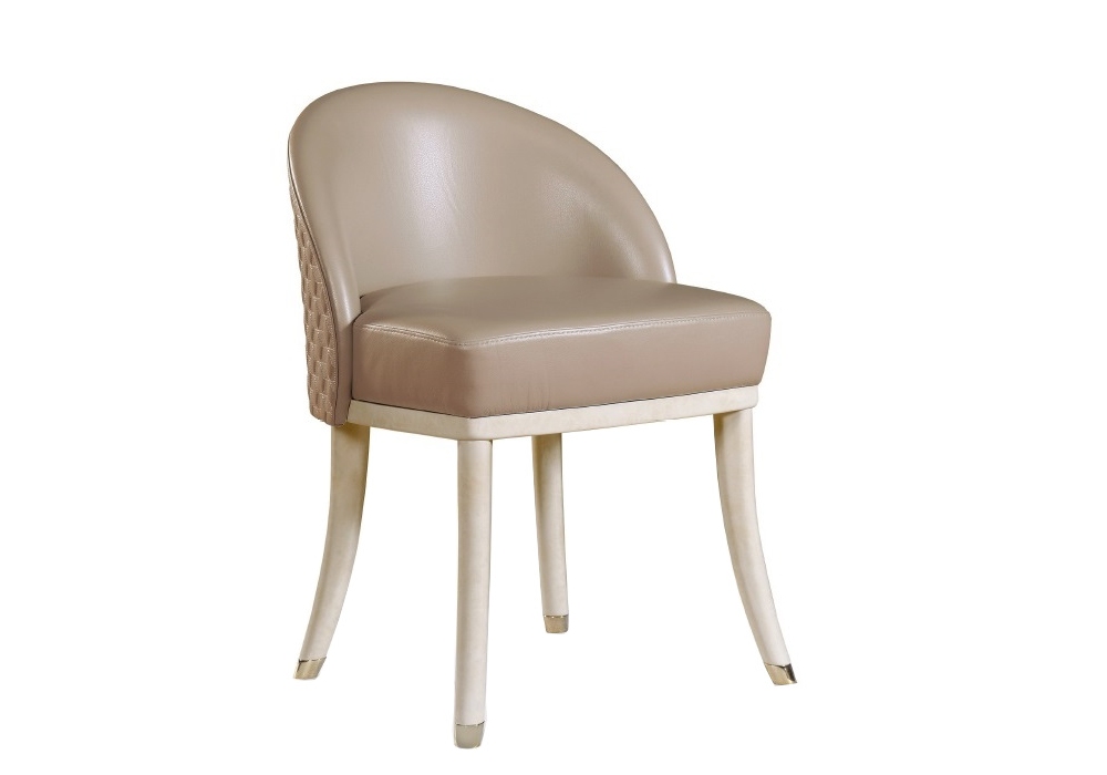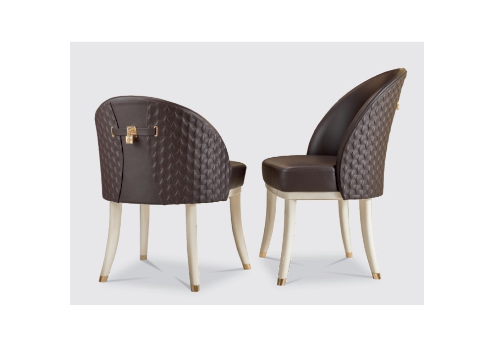 Vogue von Andrea Bonini für Turri entworfen, ist ein Stuhl mit Massivholzstruktur mit handverzierter glänzender Polyesteroberfläche. Bezug aus nicht abnehmbarem Leder oder Stoff mit Rückenlehne mit Hexagon-Stickerei. Metallteile in Gold-Finish. Verfügbar in der Version mit hoher oder niedriger Rückenlehne.