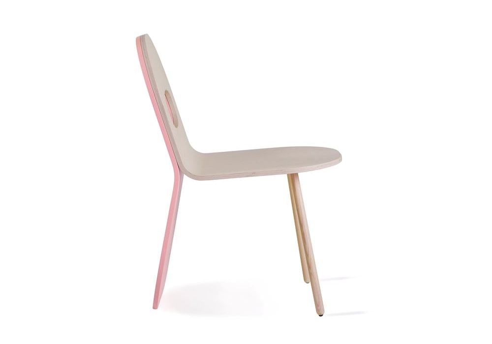 Kalmo, entworfen von Karim Rashid 2023 für Driade, ist ein Stuhl aus zwei miteinander verbundenen gebogenen Eschensperrholzplatten und Vorderbeinen aus massiver Esche.