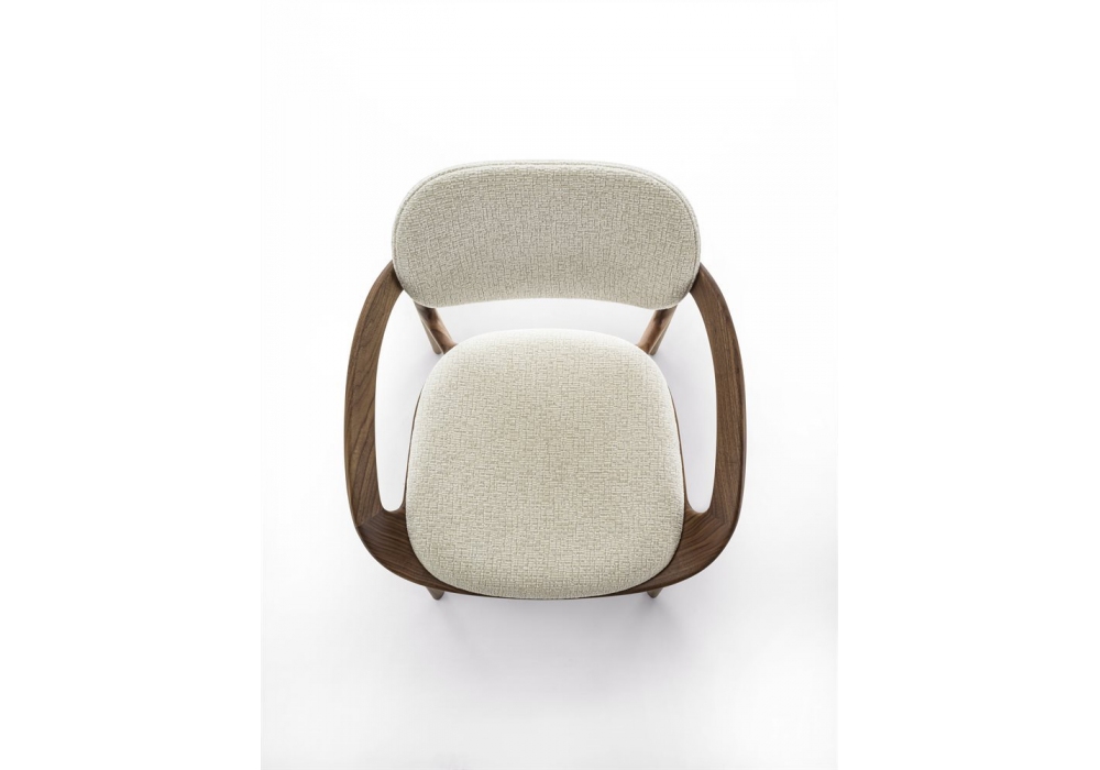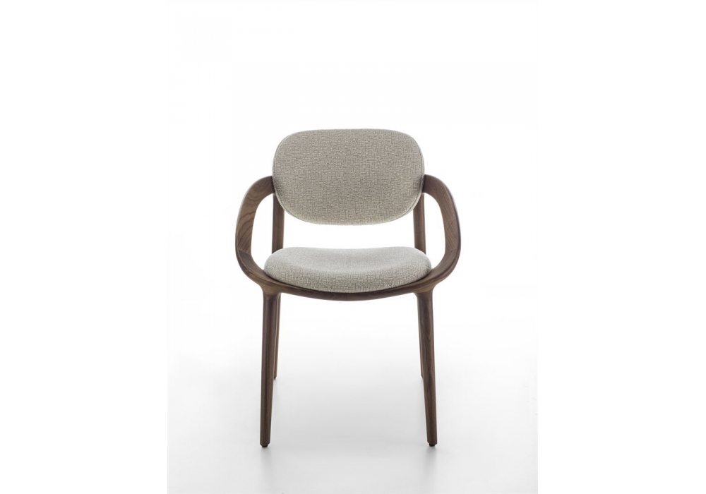 Molly von Meneghello Paolelli für Porada entworfen, ist ein Stuhl mit einer Struktur aus massivem Canaletta-Walnussholz und einer Polsterung aus Stoff oder Leder.