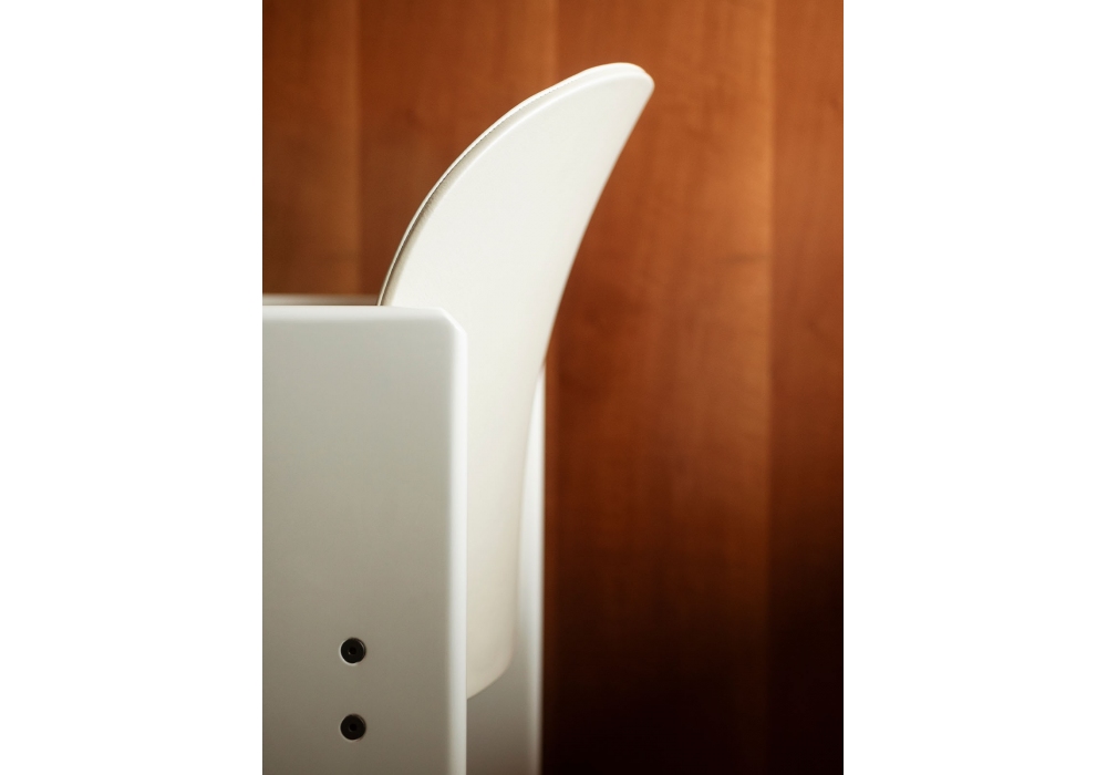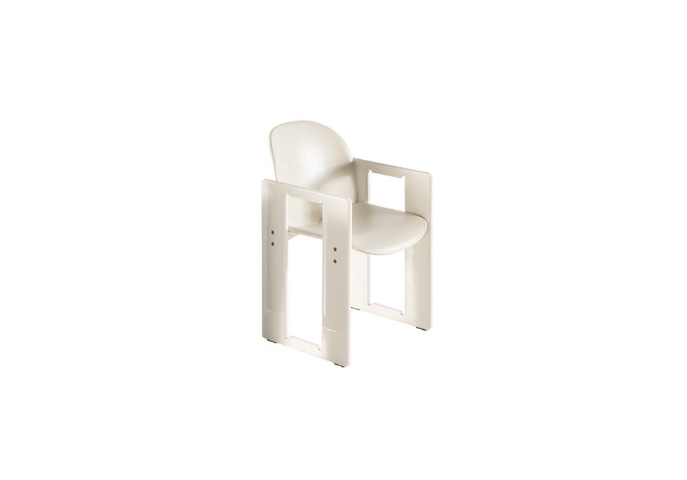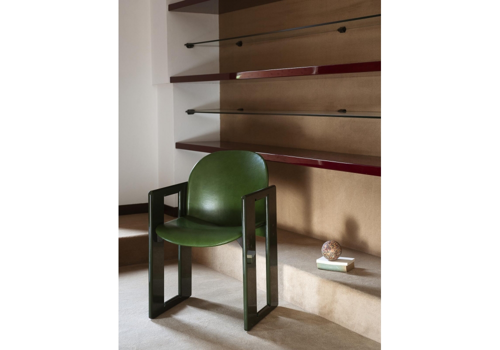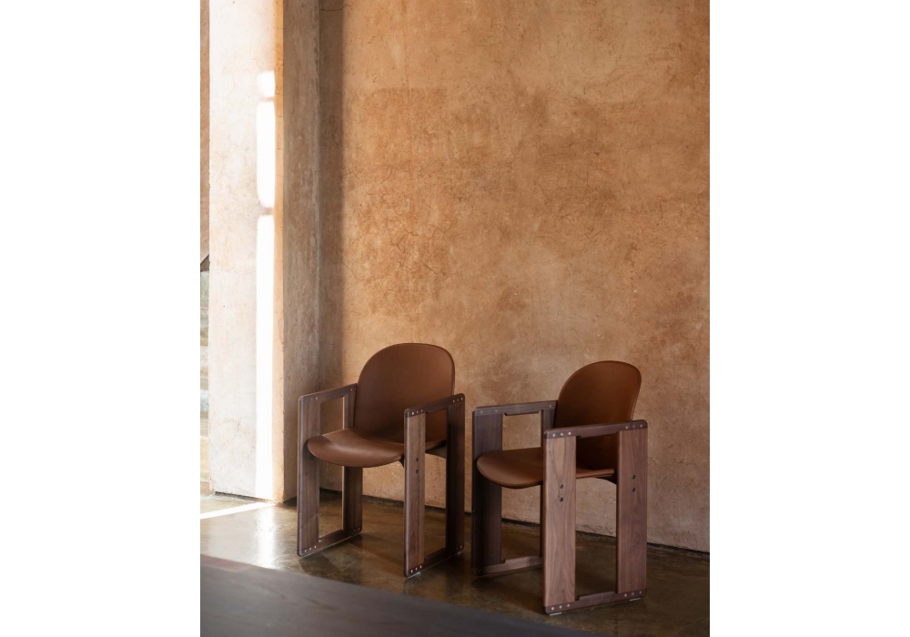 Dialogo von Tobia Scarpa für Tacchini entworfen, ist ein Stuhl mit rechteckiger Struktur mit abgerundeten Kanten aus gebeiztem Eschenholz, Canaletto-Nussbaum oder Hochglanzlack. Die Sitzfläche ist mit verschiedenen Stoffen bezogen.