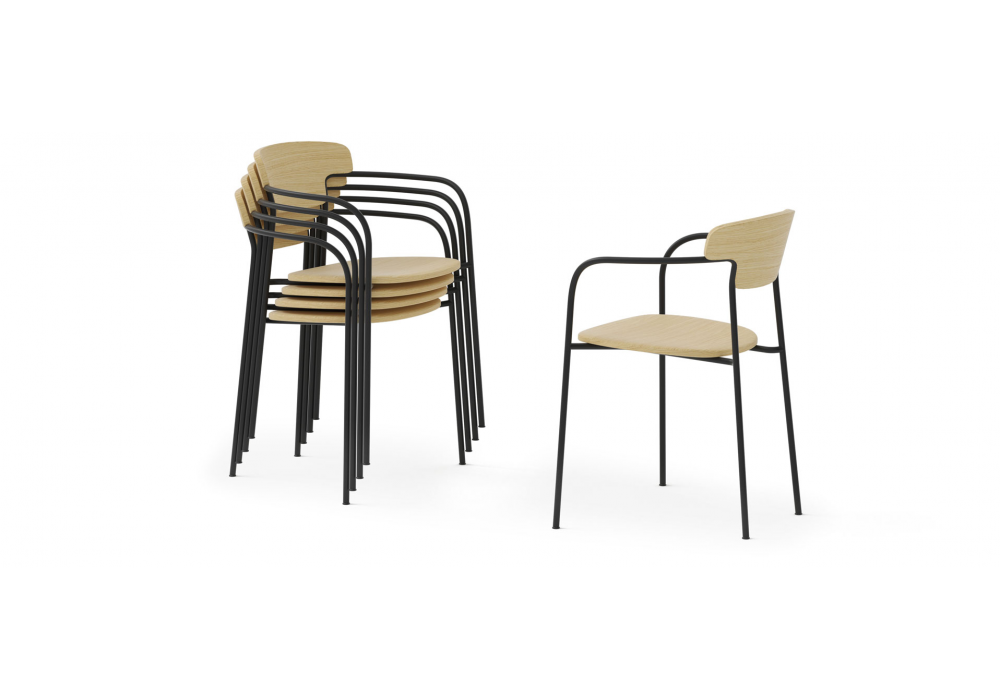 Pecan von Sebastian Herkner für Punt entworfen, ist ein Stuhl mit Metallstruktur in schwarzer Ausführung und Sitz und Rückenlehne aus natürlichem Eichensperrholz. Bis zu 4 Stühle stapelbar.