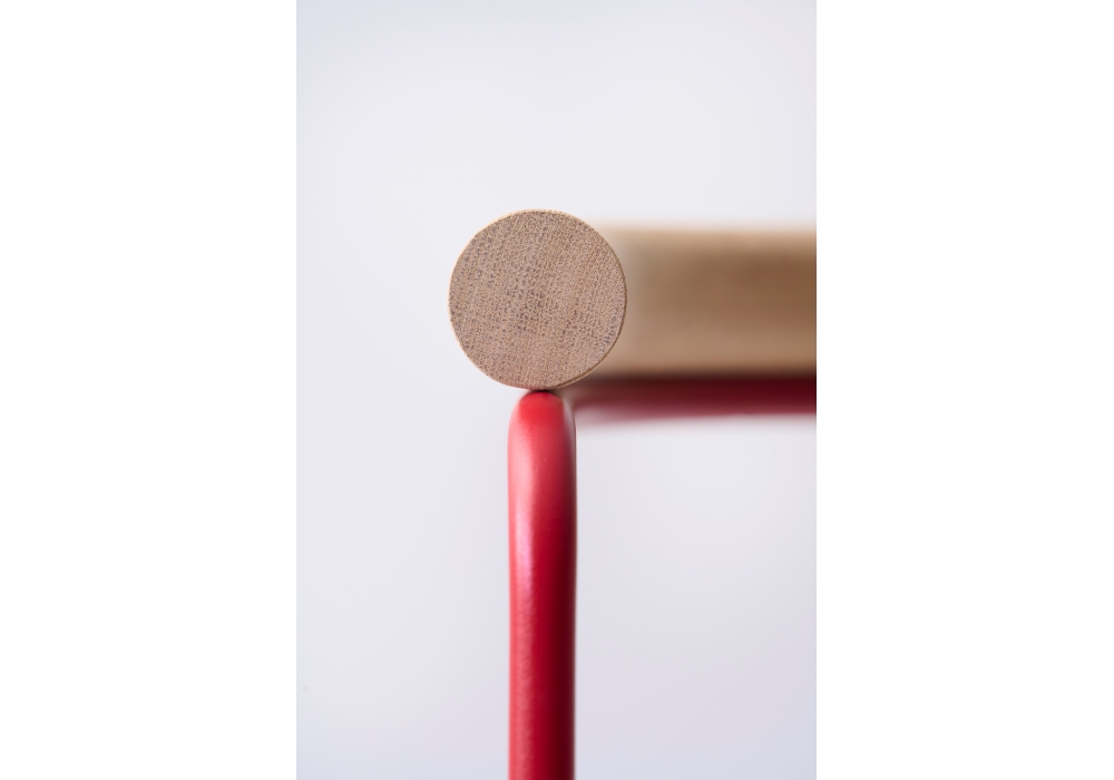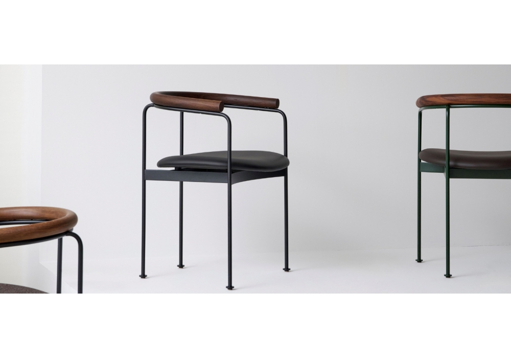 Baia, von Kensaku Oshiro für Dk3 entworfen, ist ein Stuhl mit pulverbeschichteter Stahlstruktur, Holzplatte und Sitzfläche mit Stoff- oder Lederbezug. Erhältlich in verschiedenen Ausführungen.