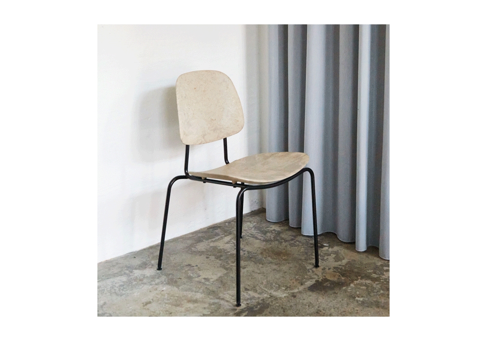 Compound Dining von OEO Studio für Mater entworfen, ist ein stapelbarer Stuhl mit Stahlbeinen in schwarzem Finish, Sitz und Rückenlehne aus Matek®, in verschiedenen Ausführungen.