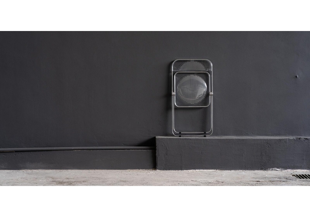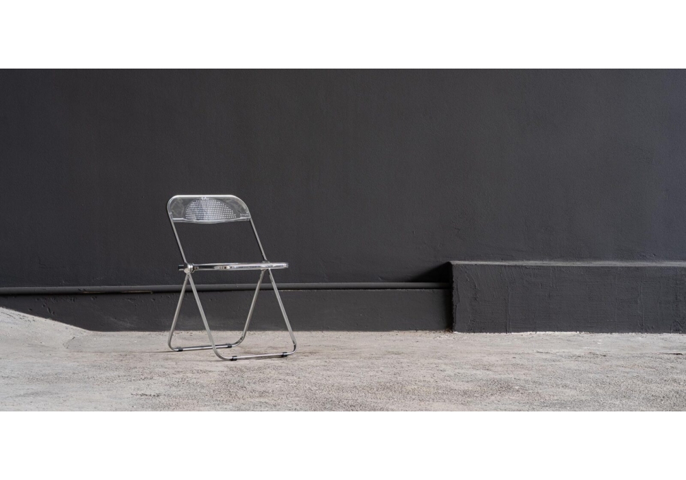 Plia 1969/2019 von Giancarlo Piretti für Codiceicona entworfen, ist ein Klappstuhl in limitierter Auflage aus transparentem Stahl mit Siebdruck.