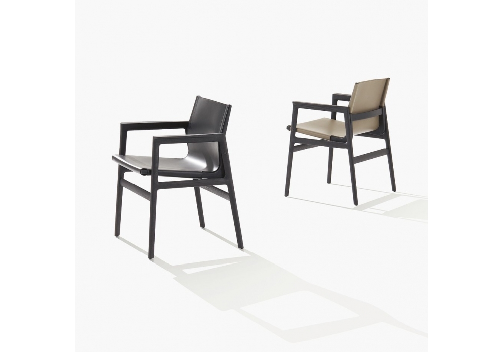 Ipanema Cuoio von Jean Marie Massaud für Poliform entworfen, ist ein Stuhl mit Struktur aus massiver Spessart-Eiche oder schwarz gebeizter Ulme. Sitz und Rückenlehne aus nicht abnehmbarem Kernleder in den Musterfarben. Mit oder ohne Armlehnen.