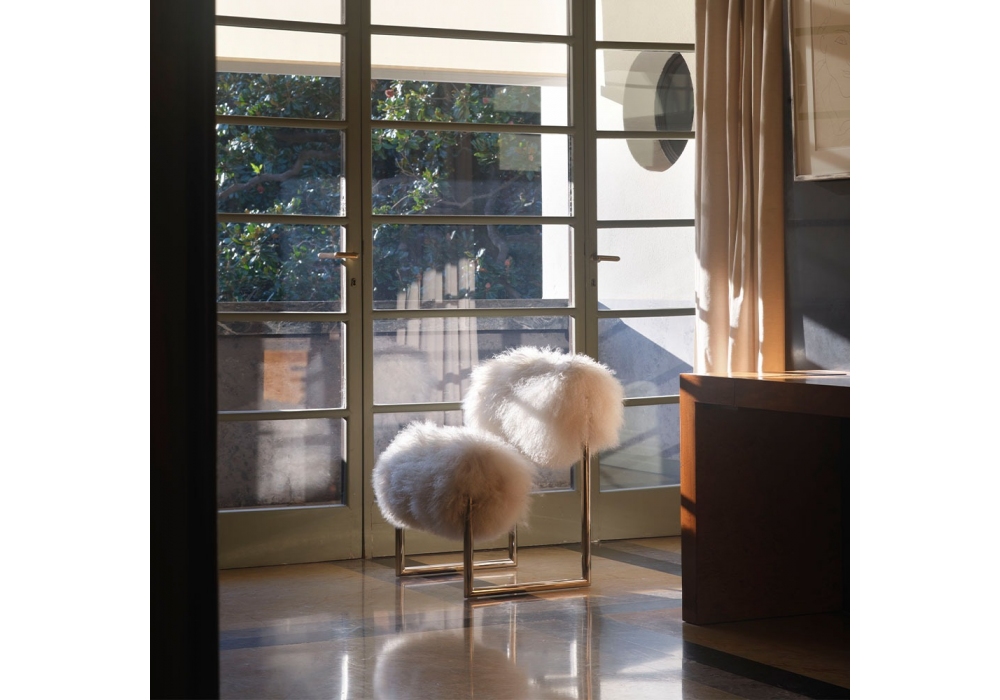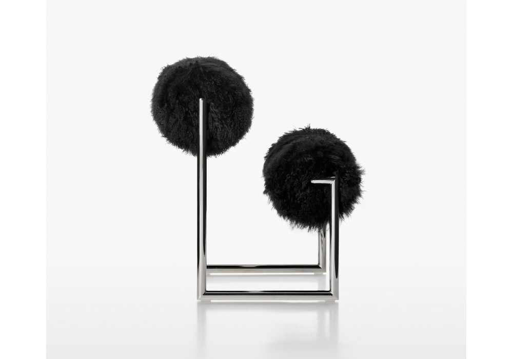 Due Più von Nanda Vigo für Acerbis entworfen ist ein Stuhl mit Stahlrohrgestell und Sitz- und Rückenlehnenbezug aus mongolischem Fell. Due Più ist in verschiedenen Ausführungen erhältlich.