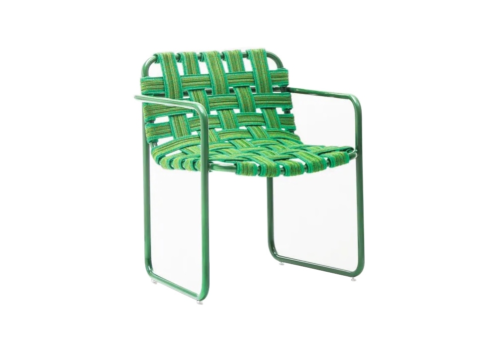 Baleari von Lina Obregón für Paola Lenti entworfen, ist ein Stuhl mit Armlehnen aus matt elfenbein- oder graphitfarben lackiertem oder glänzend lackiertem Aluminium, Spitzen aus Kunststoff. Feste Bespannung aus handgewebten zweifarbigen elastischen Bändern. Verfügbar in verschiedenen Ausführungen.
