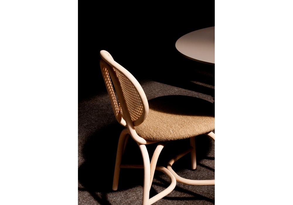 Loop von Norm Architects für Expormim entworfen, ist ein Stuhl mit Rattanstruktur und gepolstertem, mit Stoff überzogenem Sitz. Verfügbar in verschiedenen Ausführungen.