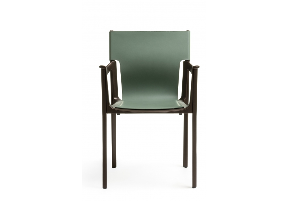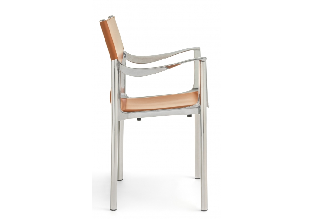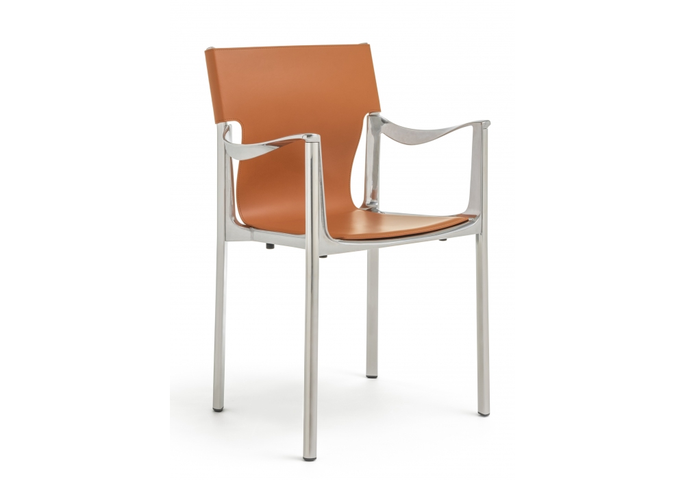 Venice von Konstantin Grcic für Magis entworfen, ist ein Stuhl mit Armlehnen mit einer Struktur aus Polyester lackiertem oder poliertem Aluminiumdruckguss. Sitz und Rückenlehne aus Leder.