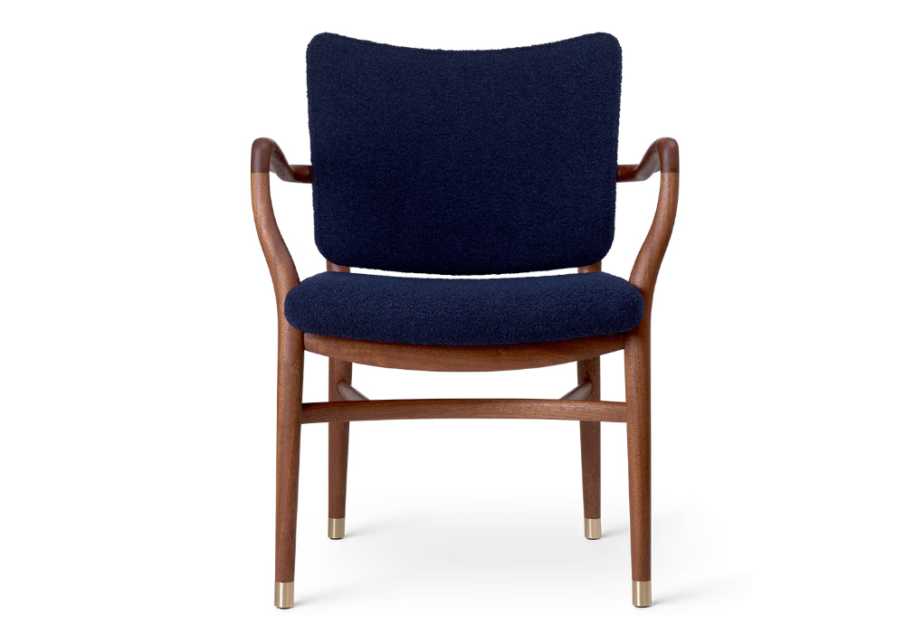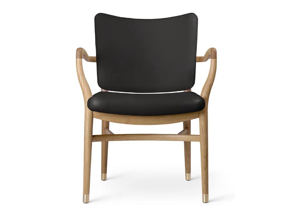 VLA61 Monarch Chair von Vilhelm Lauritzen für Carl Hansen & Søn entworfen, ist ein Stuhl mit einem Gestell aus massiver Eiche oder Mahagoni in verschiedenen Ausführungen und Messingfüßen. Sitz und Rückenlehne aus Schaumstoff mit Stoff- oder Lederpolsterung.