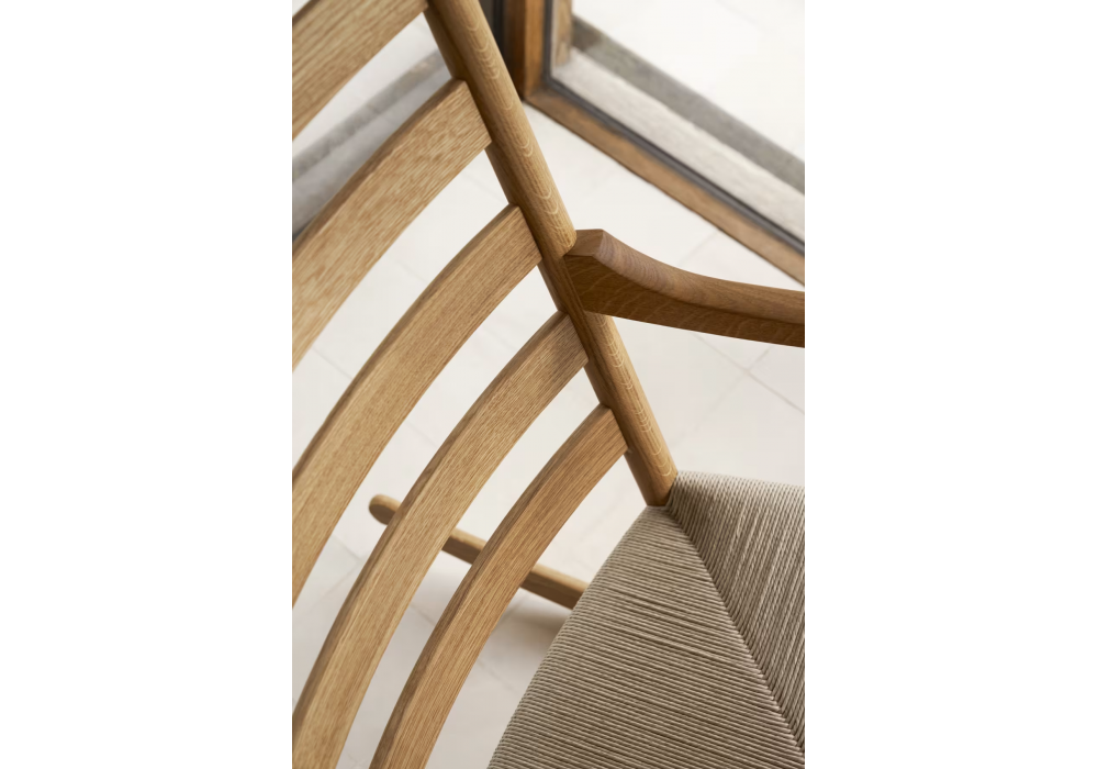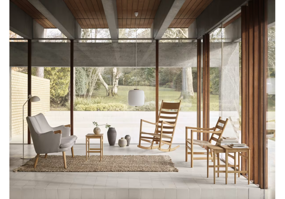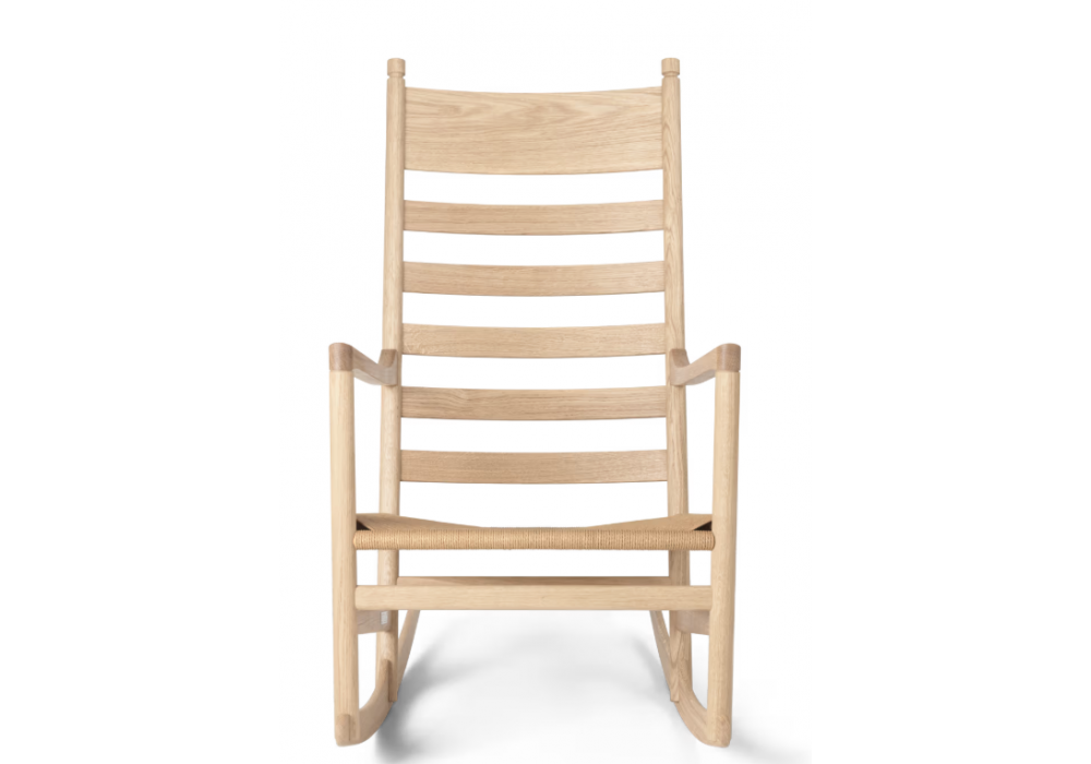 CH45 von Hans J. Wegner für Carl Hansen & Søn entworfen, ist ein Schaukelstuhl mit einem Gestell aus massiver Eiche in verschiedenen Ausführungen. Sitz aus natürlichem oder schwarzem Papierkordel. Ein Satz Kissen aus Stoff oder Leder ist auf Anfrage erhältlich.c