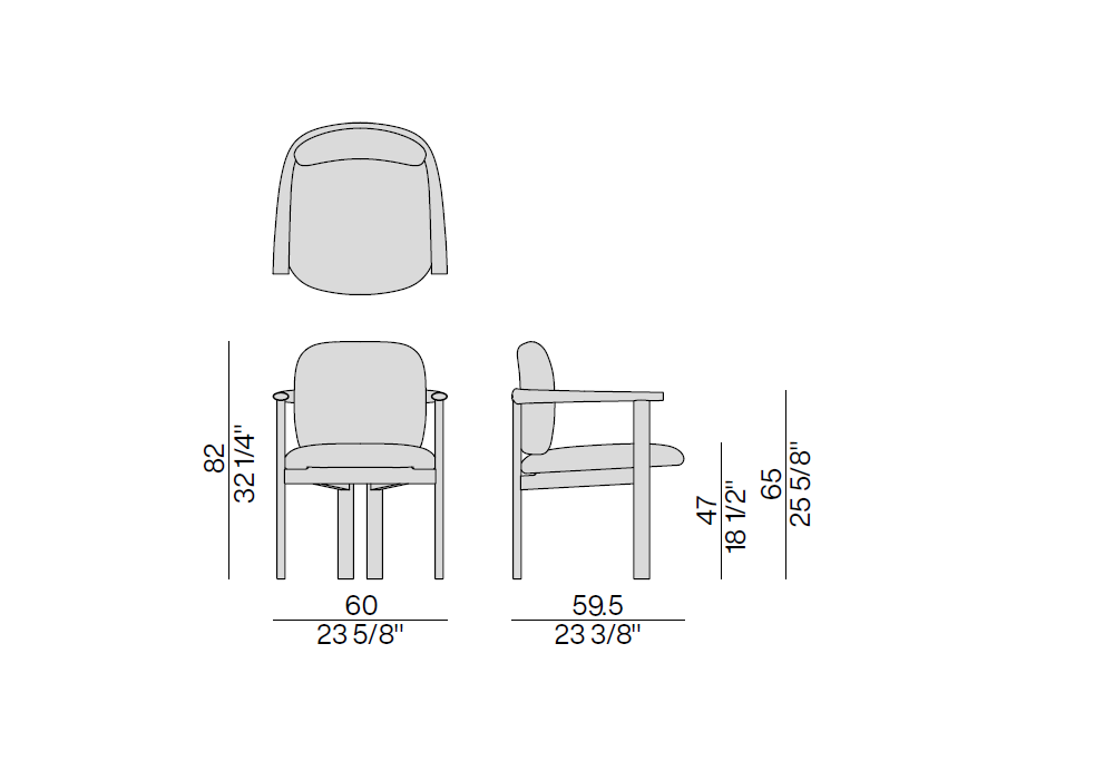 Teti von G. & O. Buratti für Porada entworfen, ist ein Stuhl mit Armlehnen mit einer Struktur aus massivem Canaletta-Nussbaumholz und Stoff- oder Lederbezug. Eine gewachste Lederkordel in Testa di Moro-Ausführung fixiert und hält das Rückenkissen (abnehmbar) an seinem Platz.