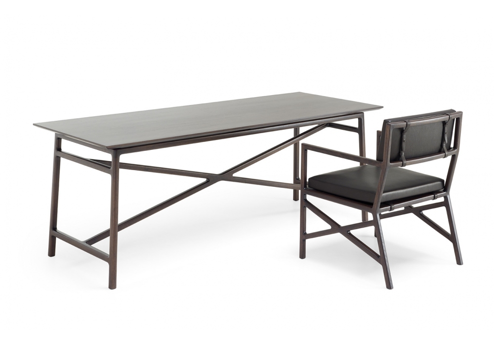 Teahouse von Christophe Pillet für Ceccotti Collezioni entworfen, ist ein Stuhl mit einer Struktur aus massivem amerikanischem Nussbaumholz. Der Sitz besteht aus furniertem Pappelsperrholz mit einer oberen Lederpolsterung, die mittels Riemen mit Nieten aus brüniertem Messing an der Struktur befestigt ist.