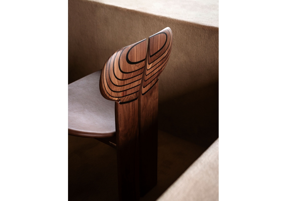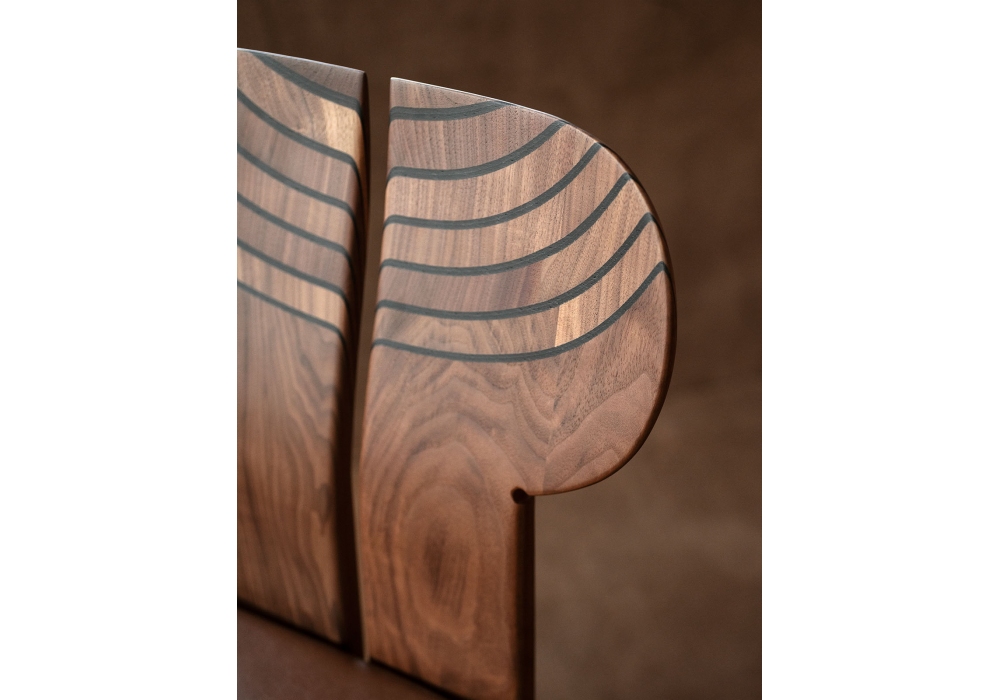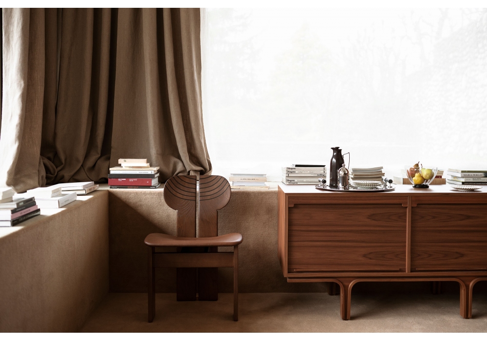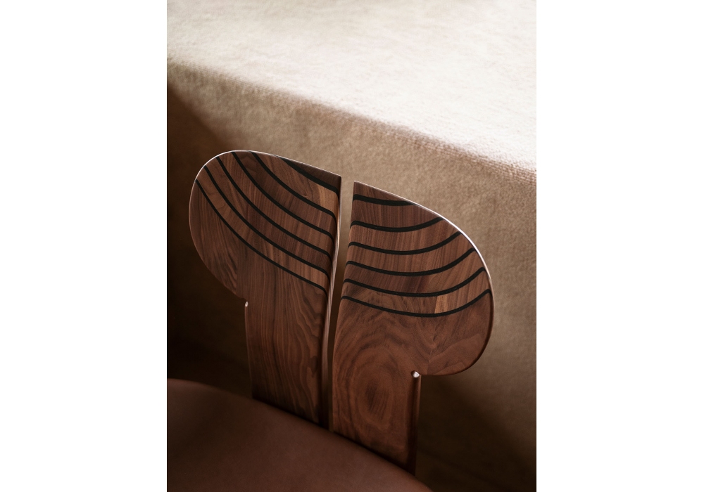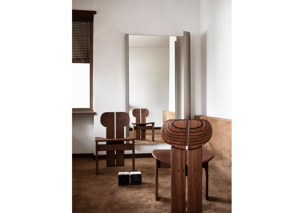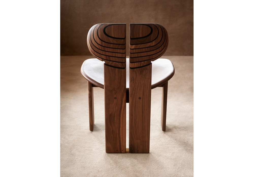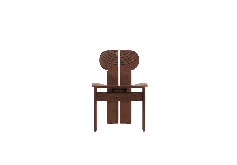 Africa von Afra & Tobia Scarpa für Tacchini entworfen, ist ein Stuhl mit einer Struktur aus Eschenholz, gebeizt in Nussbaum oder Canaletto-Nussbaum und einer Sitzfläche, die mit Stoff oder Leder bezogen ist.