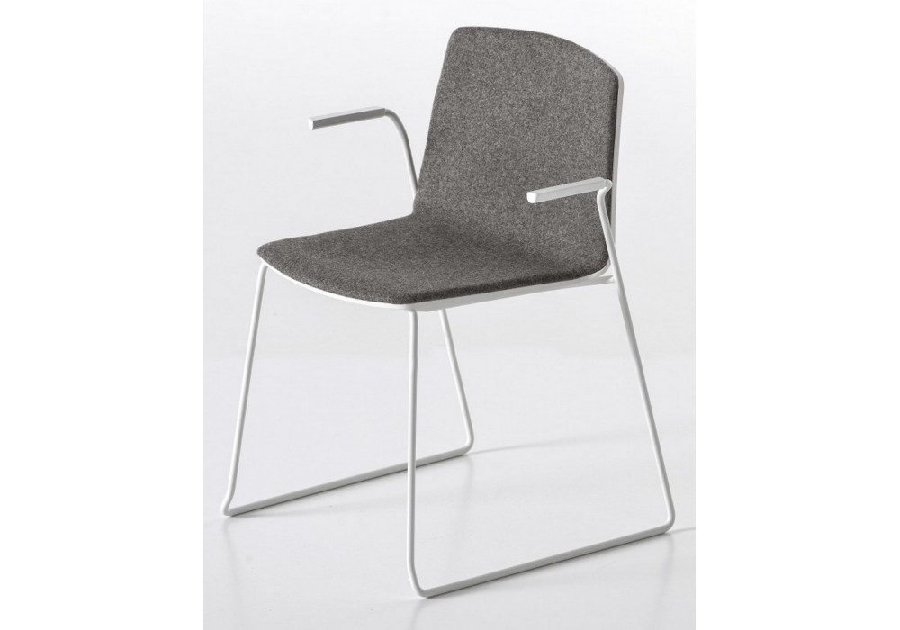 Rama von Ramos-Bassols für Kristalia entworfen, ist ein Stuhl mit Struktur aus Stahl, verfügbar in verschiedenen Ausführungen, Schale aus Polypropylen mit vorderem Bezug aus Stoff oder Leder und Armlehne aus Polypropylen.