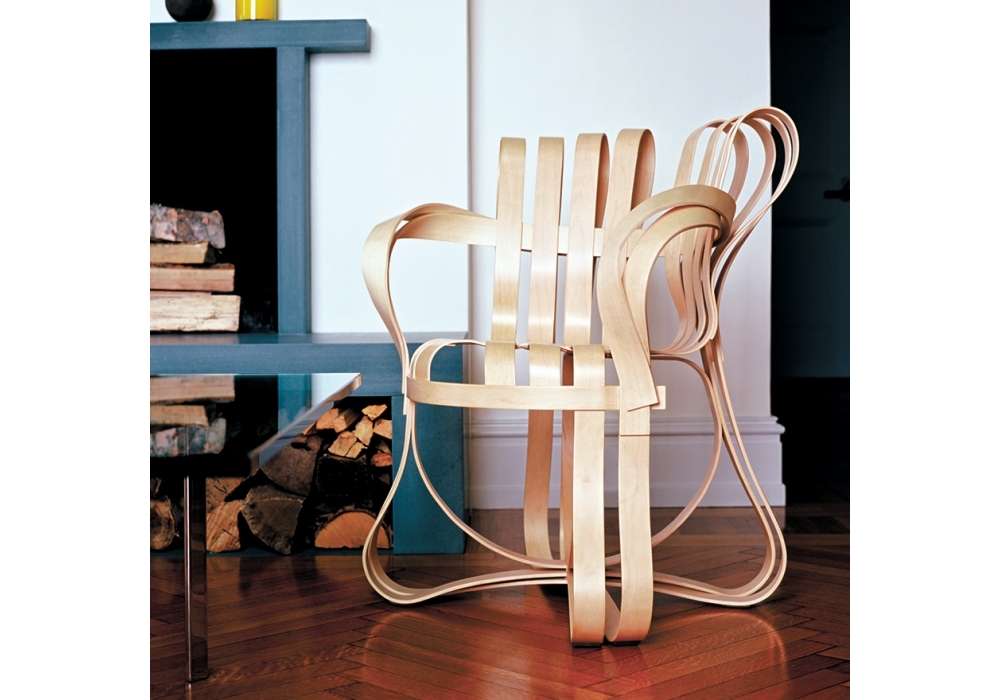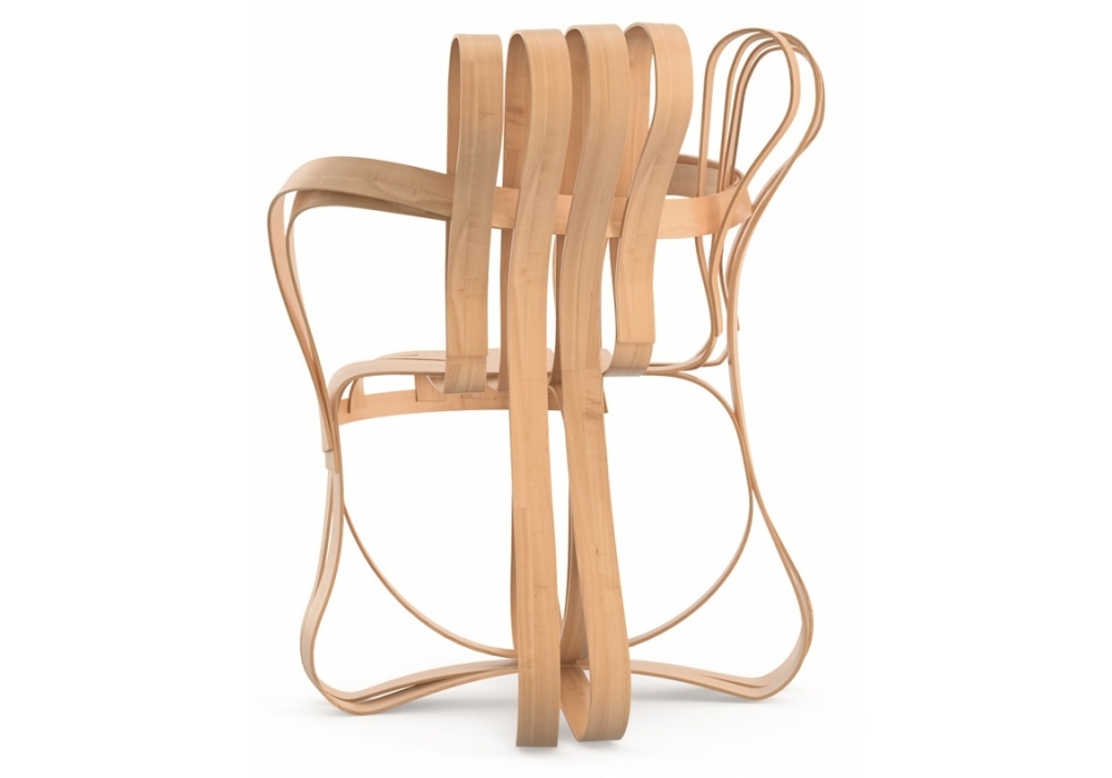 Hat Trick™ von Frank Gehry für Knoll entworfen, ist ein Stuhl mit Armlehnen aus natürlichem Ahornholz mit transparenten Kunststofffüßen mit mattem Finish. Die Rückenlehne besteht aus vorgeformten Bändern zur Verstärkung der Lendenwirbelstütze. Die Armlehnen können leicht abmontiert werden.