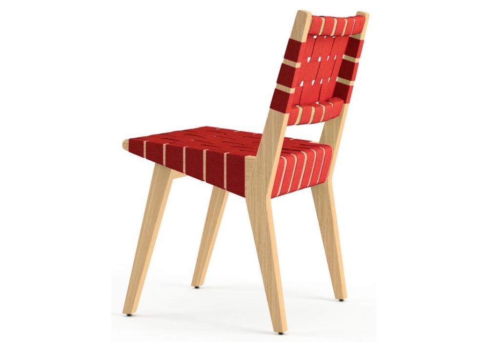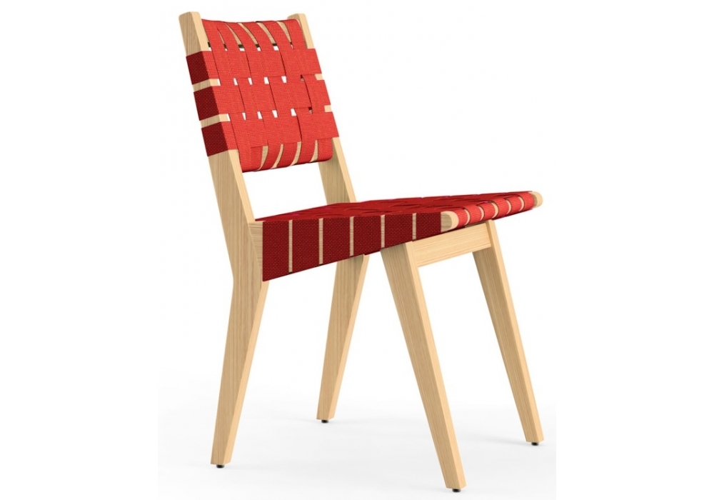 Risom von Jens Risom für Knoll entworfen, ist ein Stuhl mit einer natürlichen Ahornstruktur mit transparentem Lack. Gurte aus 100 % natürlicher Baumwolle, verfügbar in drei verschiedenen Farben.