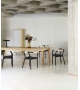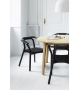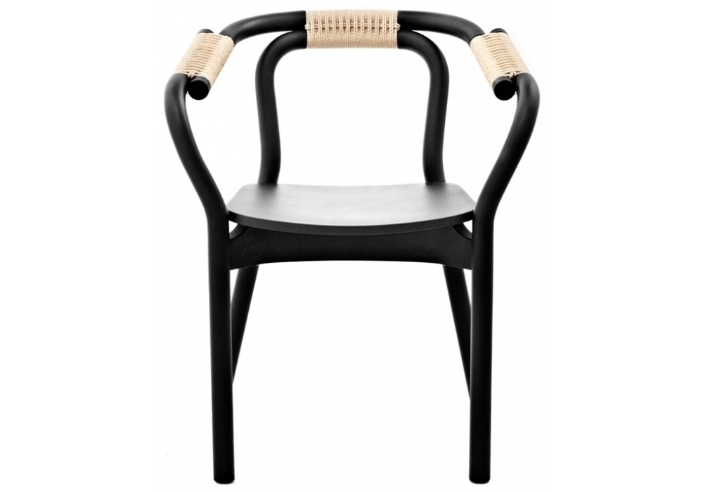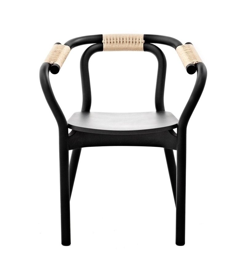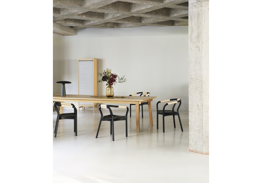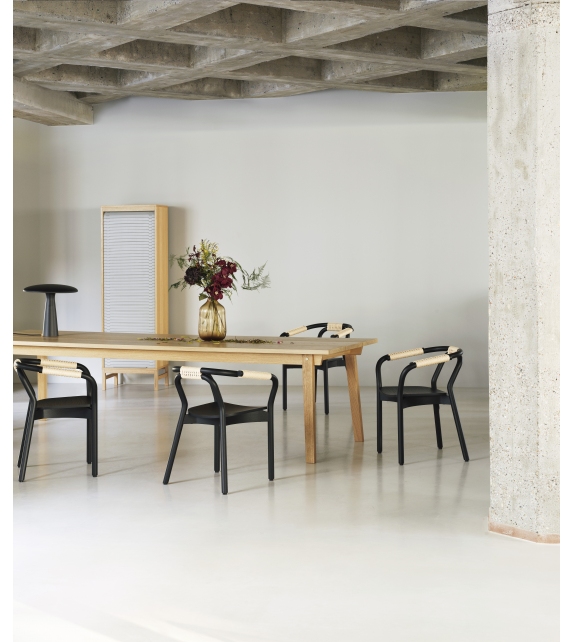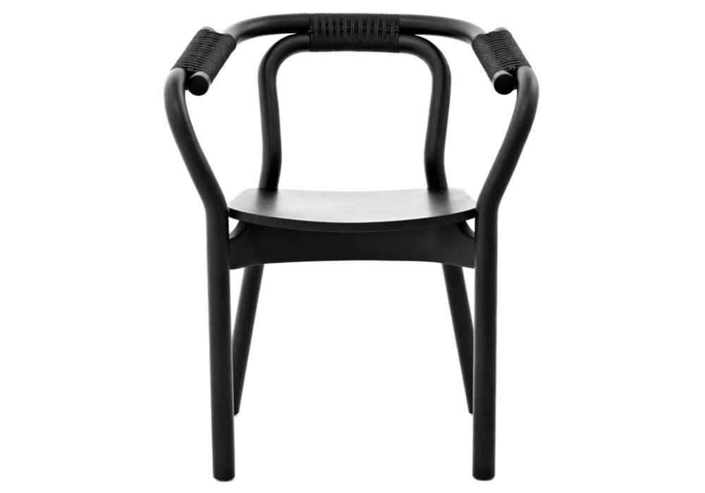 Knot, von Tatsuo Kuroda für Normann Copenhagen entworfen, ist ein Stuhl komplett aus schwarzem Eschenholz. Die Sitzfläche ist immer aus leicht geschwungenem Holz, während die Rückenlehne und die Armlehnen aus Holzrohr bestehen, das sich harmonisch in die Struktur einfügt und von einem Papierseilgeflecht zusammengehalten wird. Knot ist in zwei Versionen erhältlich, Struktur und Details aus schwarzem Seil oder schwarze Struktur und Details aus hellem Naturseil.