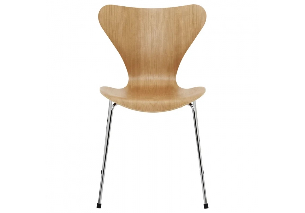 Series 7 von Arne Jacobsen für Fritz Hansen entworfen, ist ein Stuhl mit Schale aus furniertem Holz oder lackierter oder gefärbter Esche und Beinen aus Stahlrohr oder pulverbeschichtetem Stahl. Verfügbar in mehreren Ausführungen.