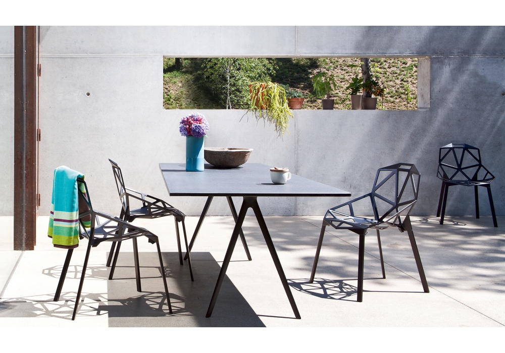 Chair_One von Konstantin Grcic für Magis entworfen, ist ein stapelbarer Stuhl, der auch für den Außenbereich geeignet ist. Beine aus lackierten Aluminiumprofilen und Sitz aus Aluminiumdruckguss mit fluorierter Titanbehandlung und Polyesterlackierung. Auf Anfrage ist es möglich, das Sitzkissen hinzuzufügen.