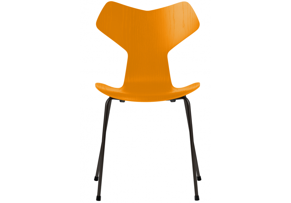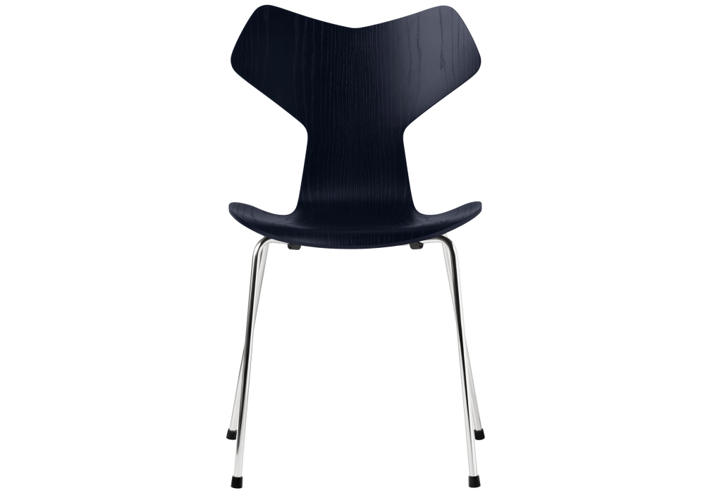 Grand Prix von Arne Jacobsen für Fritz Hansen entworfen, ist ein stapelbarer Stuhl mit Schale aus Eiche, Nussbaum oder gefärbtem oder lackiertem Eschenfurnier und Beinen aus verchromtem oder pulverbeschichtetem Stahlrohr. Verfügbar in mehreren Ausführungen.