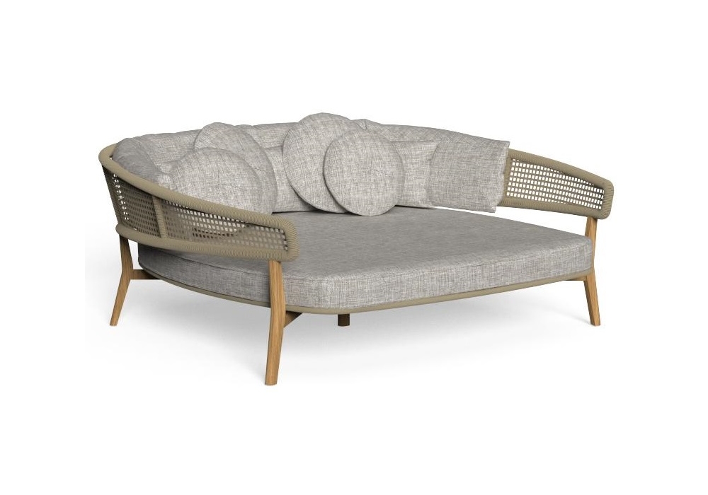 Moon Teak von Cristian Visentin für Talenti entworfen, ist ein Tagesbett mit Rückenlehne aus Seil und Struktur aus Teakholz. Die Kissen haben abnehmbare Bezüge und sind mit wetterbeständigen Outdoor-Stoffen bezogen.