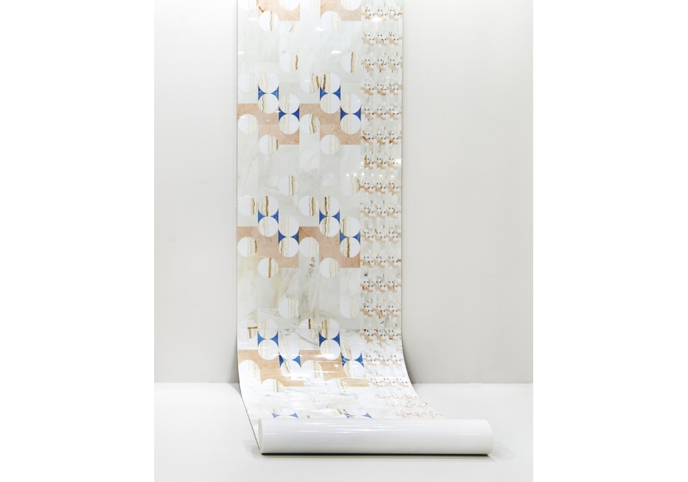 Ballon von Patricia Urquiola für Budri entworfen, ist eine Tapete bestehend aus Wandeinlage, gebogenem Element und Boden. Marmorrolle in Bianco Lasa vervollständigt die Realisierung. Mikromuster nur auf Anfrage.