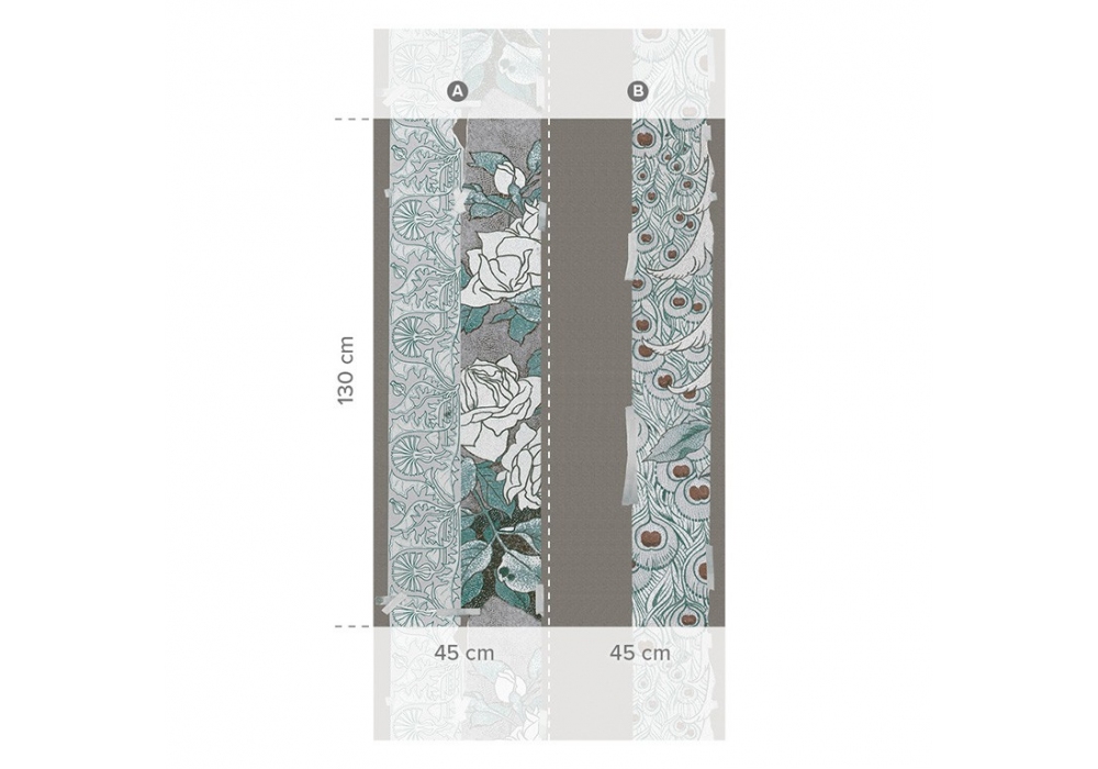 Peacock TS, entworfen und hergestellt von Wall & Decò, ist eine digital bedruckte Vliestapete. Beschichteter Vliesstoff auf Basis von Cellulosefasern und Polyesterfasern, wasserbasierten Tinten und organischen Pigmenten. Erhältlich in verschiedenen Ausführungen.