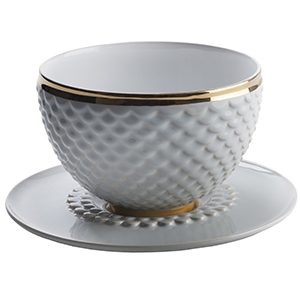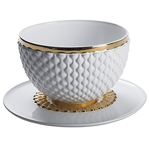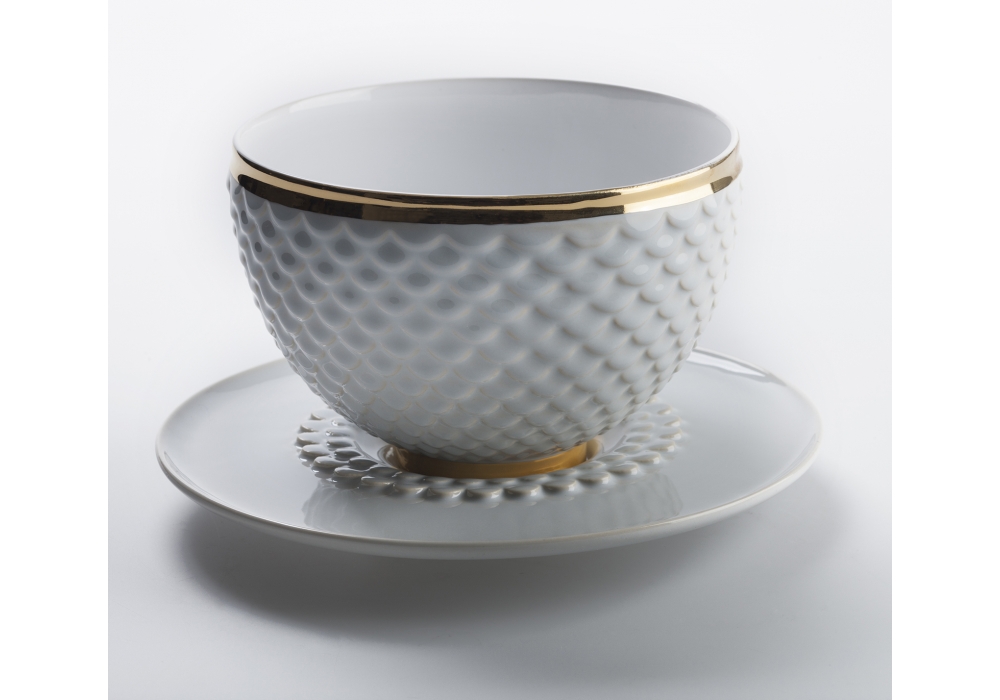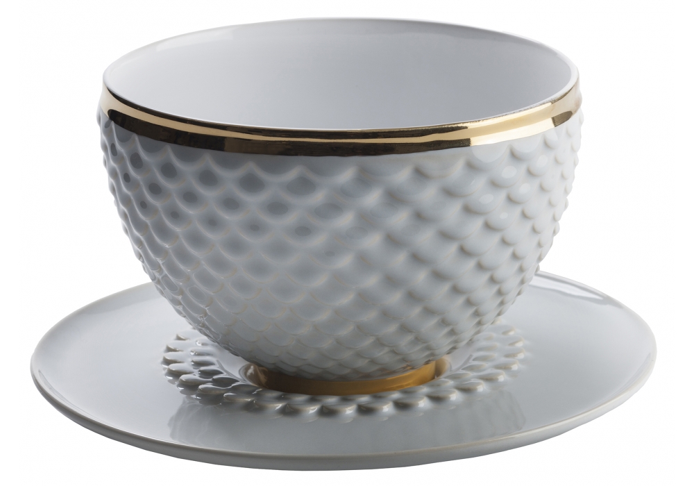 Escamas, von Elena Salmistraro für Bosa entworfen, ist eine Tasse in Keramik angereichert mit farbigen Glasuren und Edelmetallen, mit sehr detaillierten 3D-Texturen inspiriert von natürlichen Elementen, wie Tier Muscheln und wunderbare arabische Dekorationen, das erstellen von zwei verschiedenen Modellen: Kora und Rabat. Verfügbar in mehreren Ausführung.