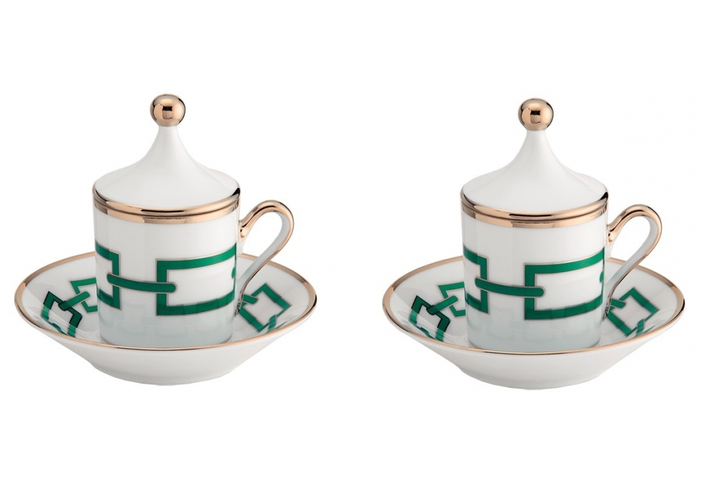 Tazza Caffè con Piatto e Coperchio Catene Smeraldo von Ginori 1735 entworfen, ist ein Set aus 2 dekorierten Kaffeebechern. Mit Untertasse und Deckel.