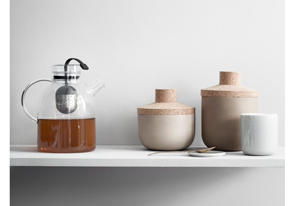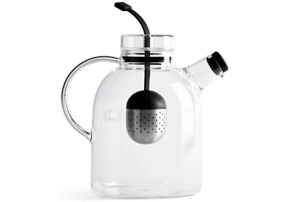Kettle Teapot von Norm Architects für Audo Copenhagen entworfen, ist eine Teekanne aus Glas, Edelstahl und Silikonkordel und Stopfen.