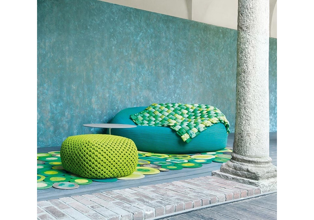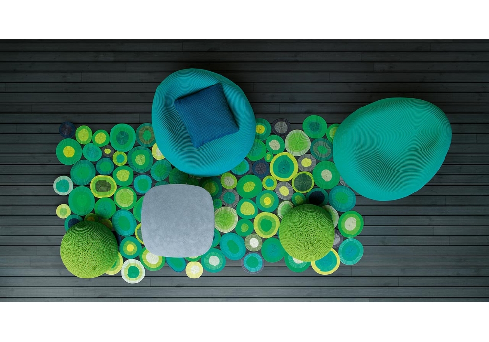 Ellissi von CRS Paola Lenti entworfen, ist einer schöner Teppich für Innen und Außenumgebungen, die mit Elementen aus ein- oder zweifarbigen Schnüren hergestellt wurden. Die Schnüre sind geformt und von Hand genäht, um runde und ovale Dekorationsmodule zu bilden. Diese Module werden dann frei miteinander verbunden, um die Oberfläche des Teppichs zu bilden.